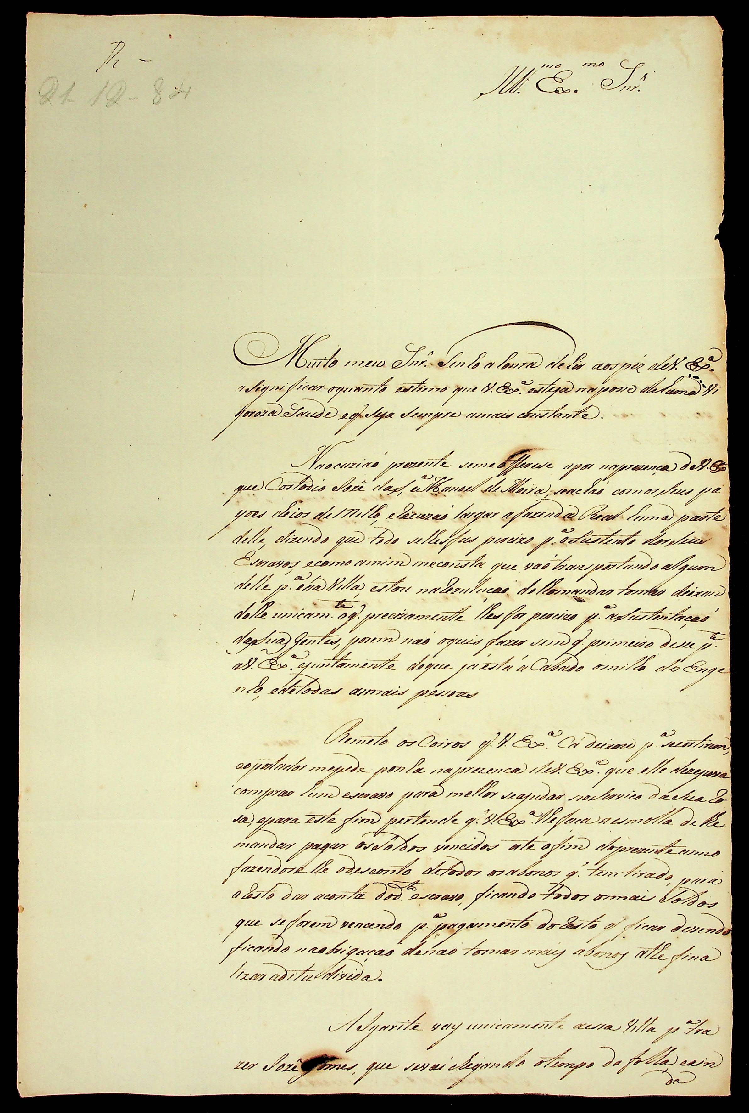 CARTA de Joaquim José Pereira ao Governador e Capitão-General da Capitania de Mato Grosso Luiz de Albuquerque de Mello Pereira e Cáceres.