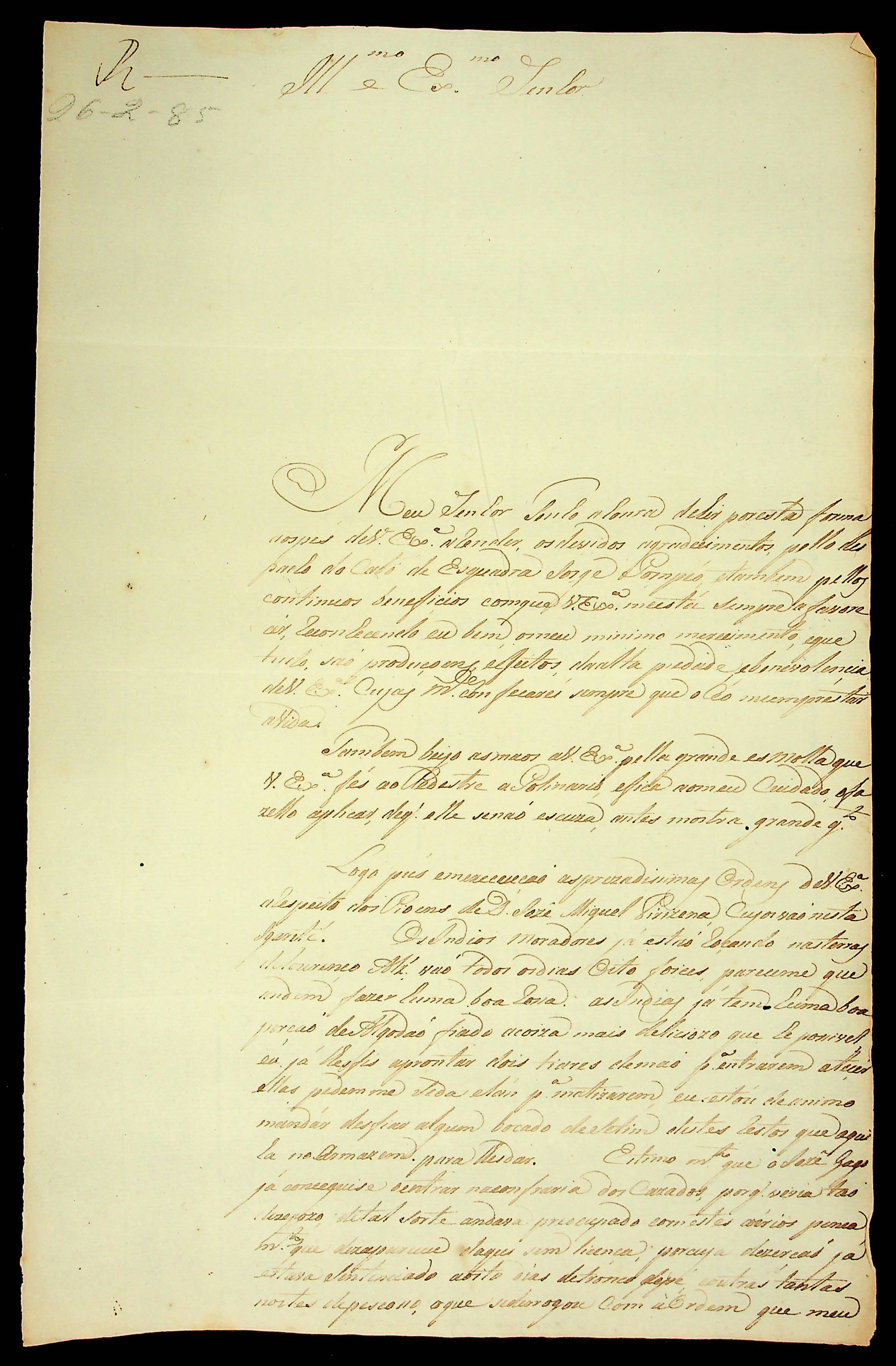 CARTA do [Capitão e Comandante] Joaquim José Ferreira ao [Governador e Capitão-General da Capitania de Mato Grosso] Luiz de Albuquerque de Mello Pereira e Cáceres.