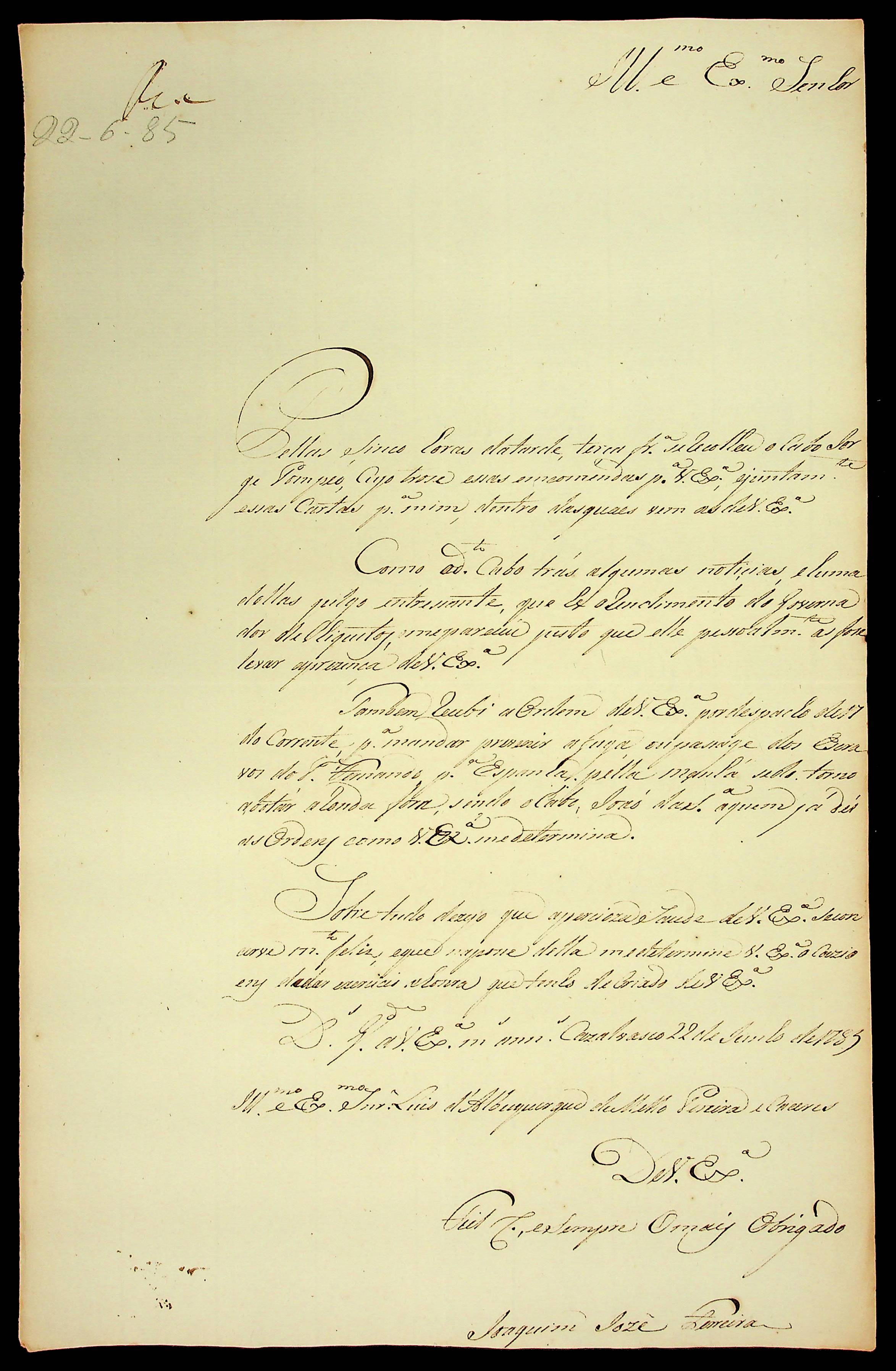 CARTA do [Comandante e Capitão] Joaquim José Ferreira ao [Governador e Capitão-General da Capitania de Mato Grosso] Luiz de Albuquerque de Mello Pereira e Cáceres.