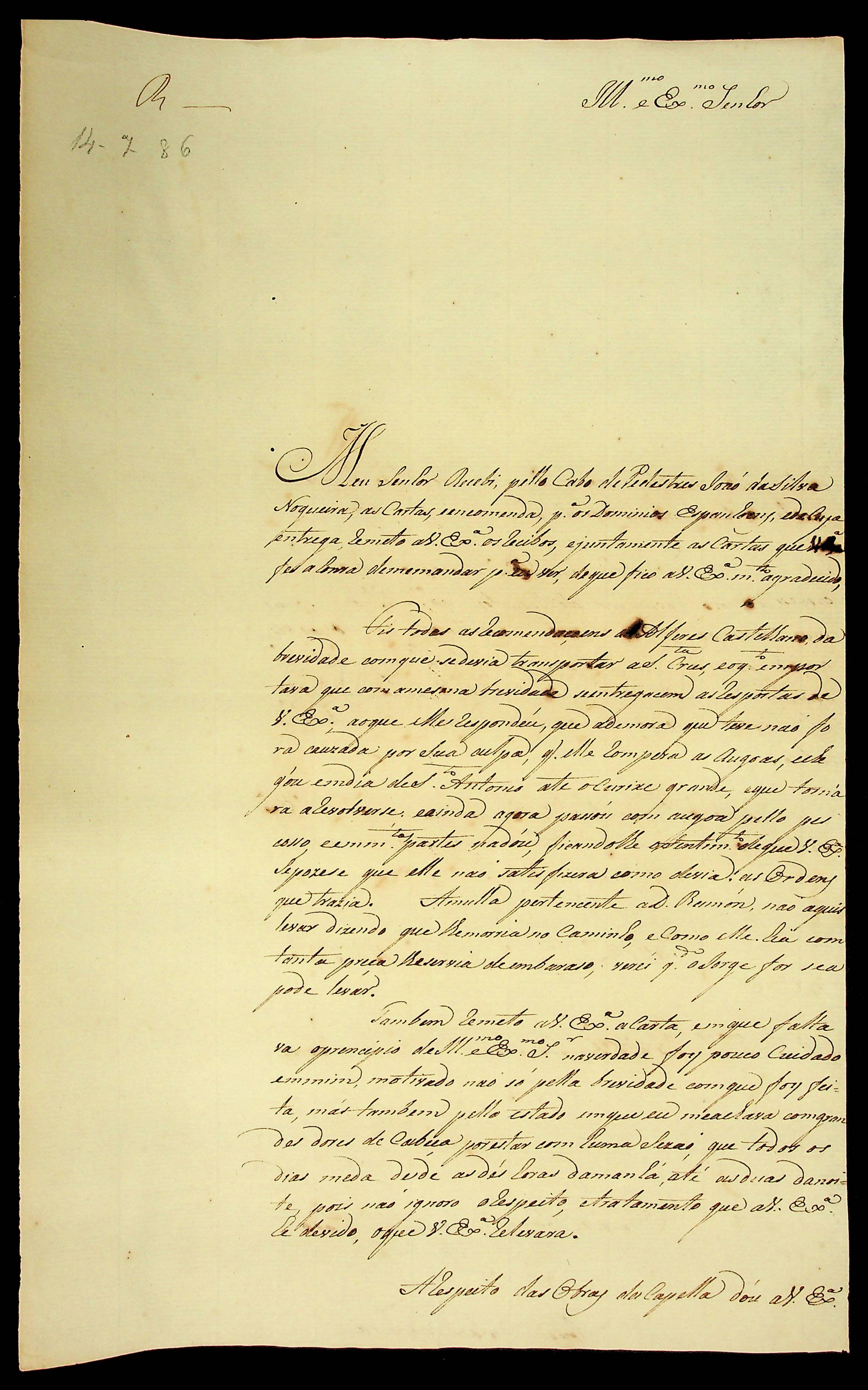 CARTA de Joaquim José Ferreira ao [Governador e Capitão-General de Mato Grosso] Luiz de Albuquerque de Mello Pereira e Cáceres.