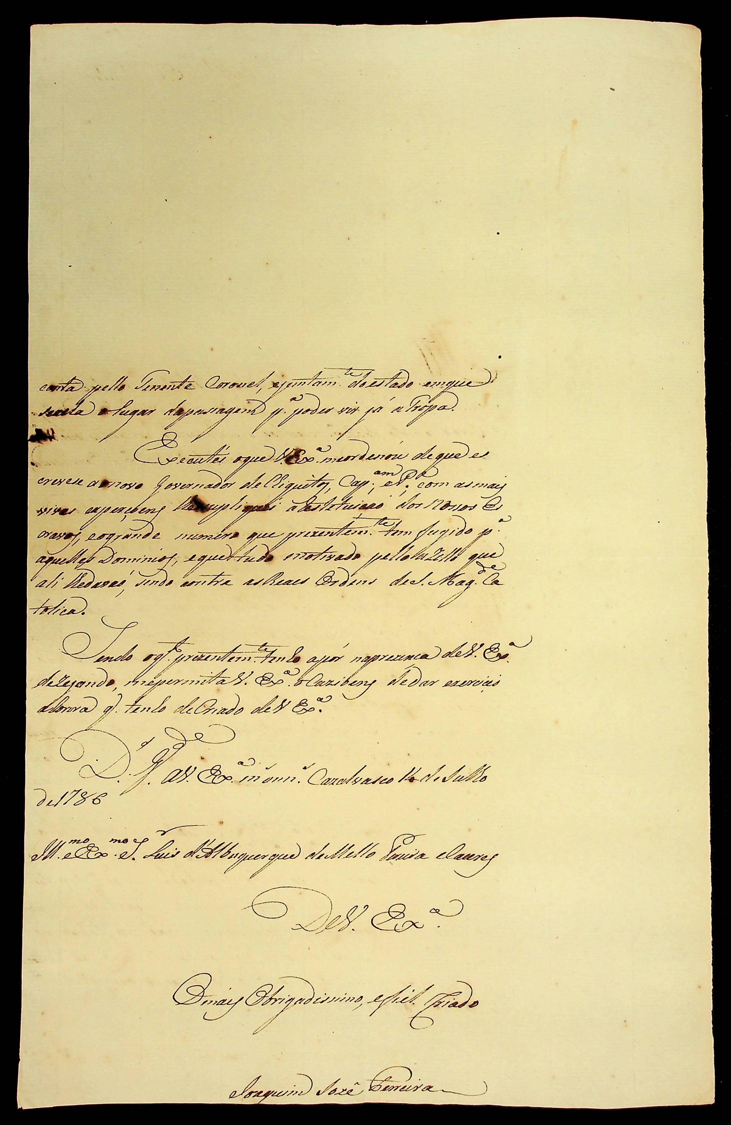 CARTA de Joaquim José Ferreira ao [Governador e Capitão-General de Mato Grosso] Luiz de Albuquerque de Mello Pereira e Cáceres.