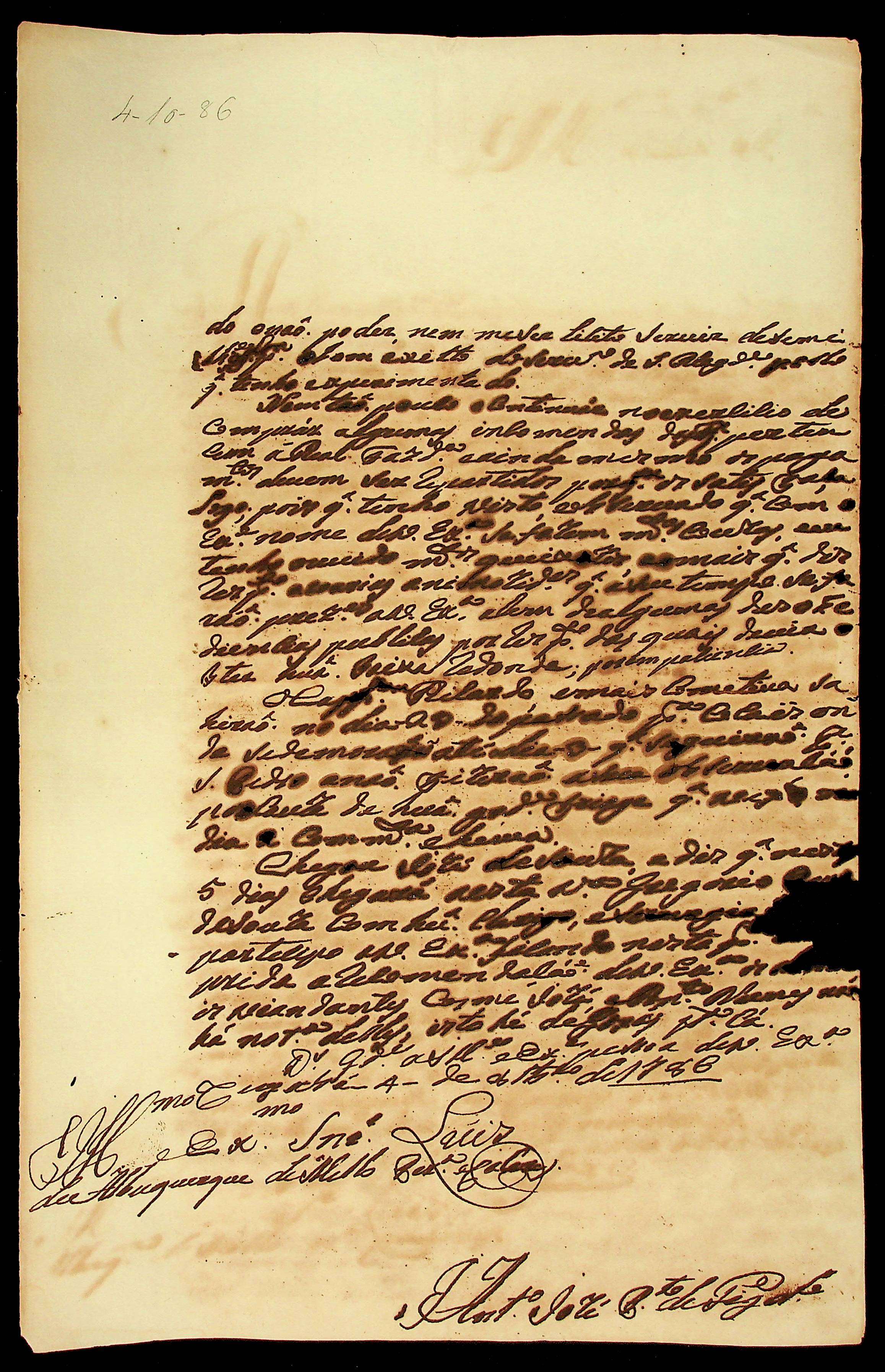 CARTA (incompleta) do [Mestre de Campo] Antônio José Pinto de Figueiredo ao [Governador e Capitão-Generalde Mato Grosso] Luiz de Albuquerque de Mello Pereira e Cáceres.
