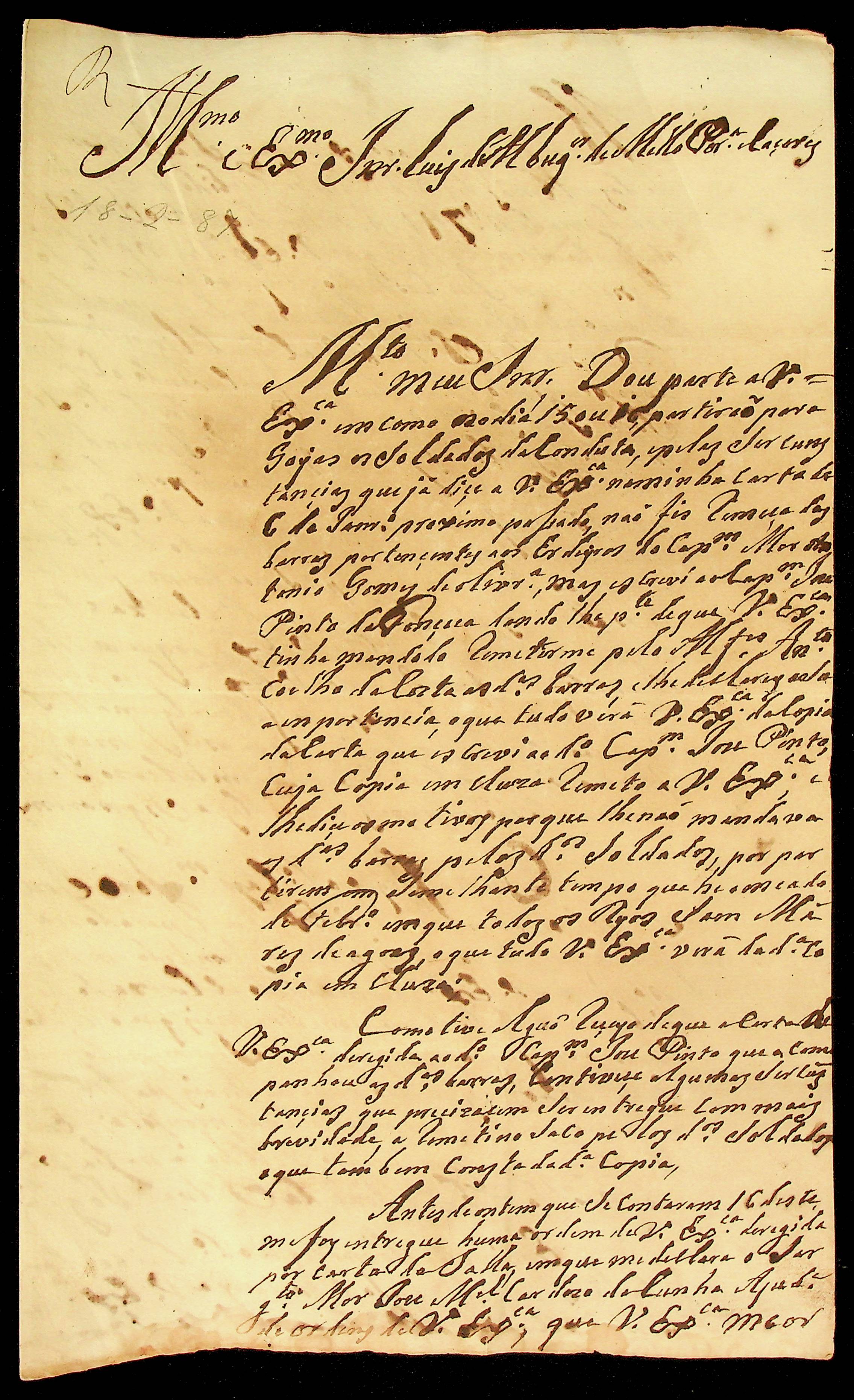 CARTA de José Pereira Nunes ao [Governador e Capitão-General da Capitania de Mato Grosso] Luiz de Albuquerque de Mello Pereira e Cáceres.