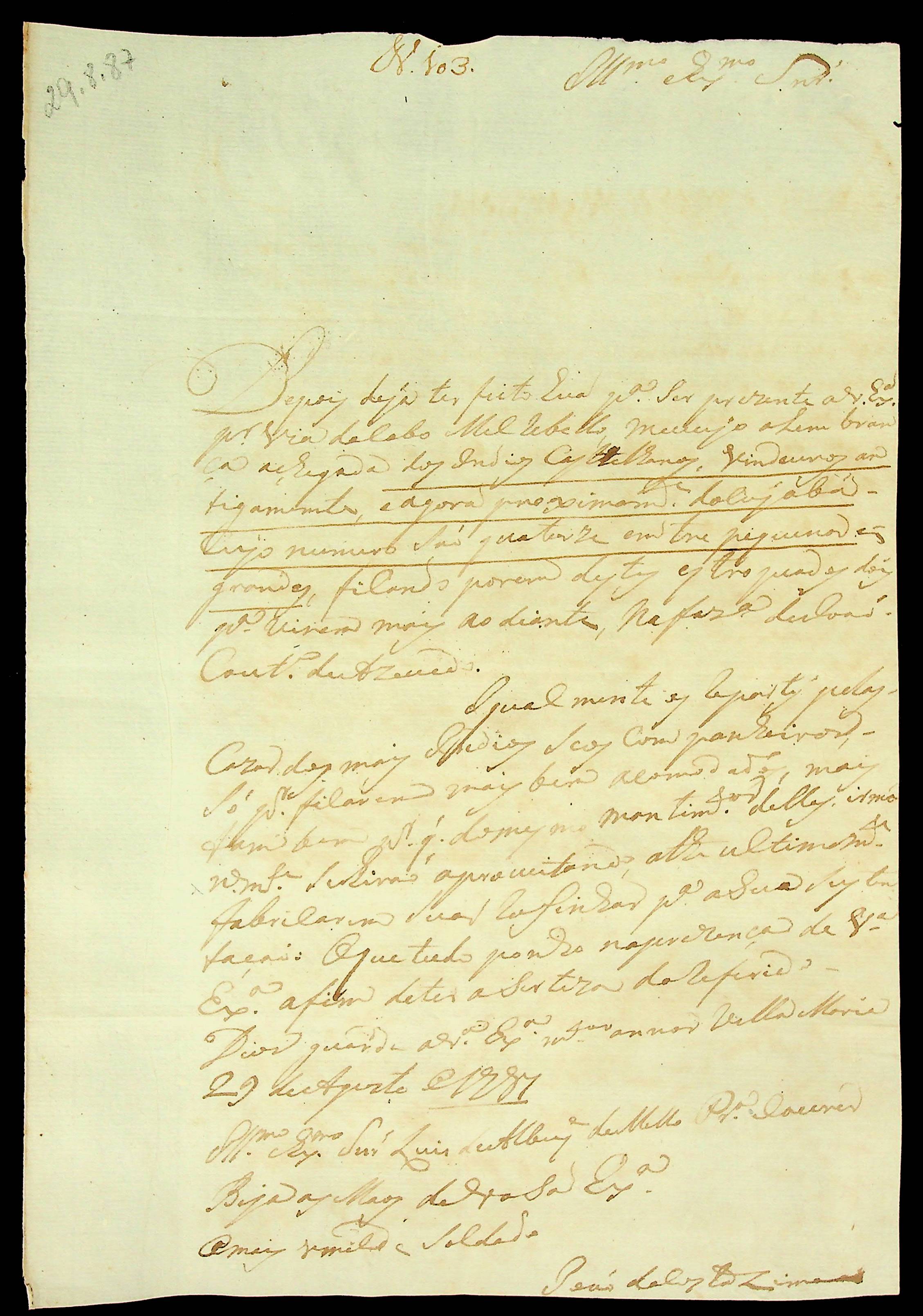 CARTA do Soldado João da Costa Lima ao [Governador e Capitão-General da Capitania de Mato Grosso] Luiz de Albuquerque de Mello Pereira e Cáceres.