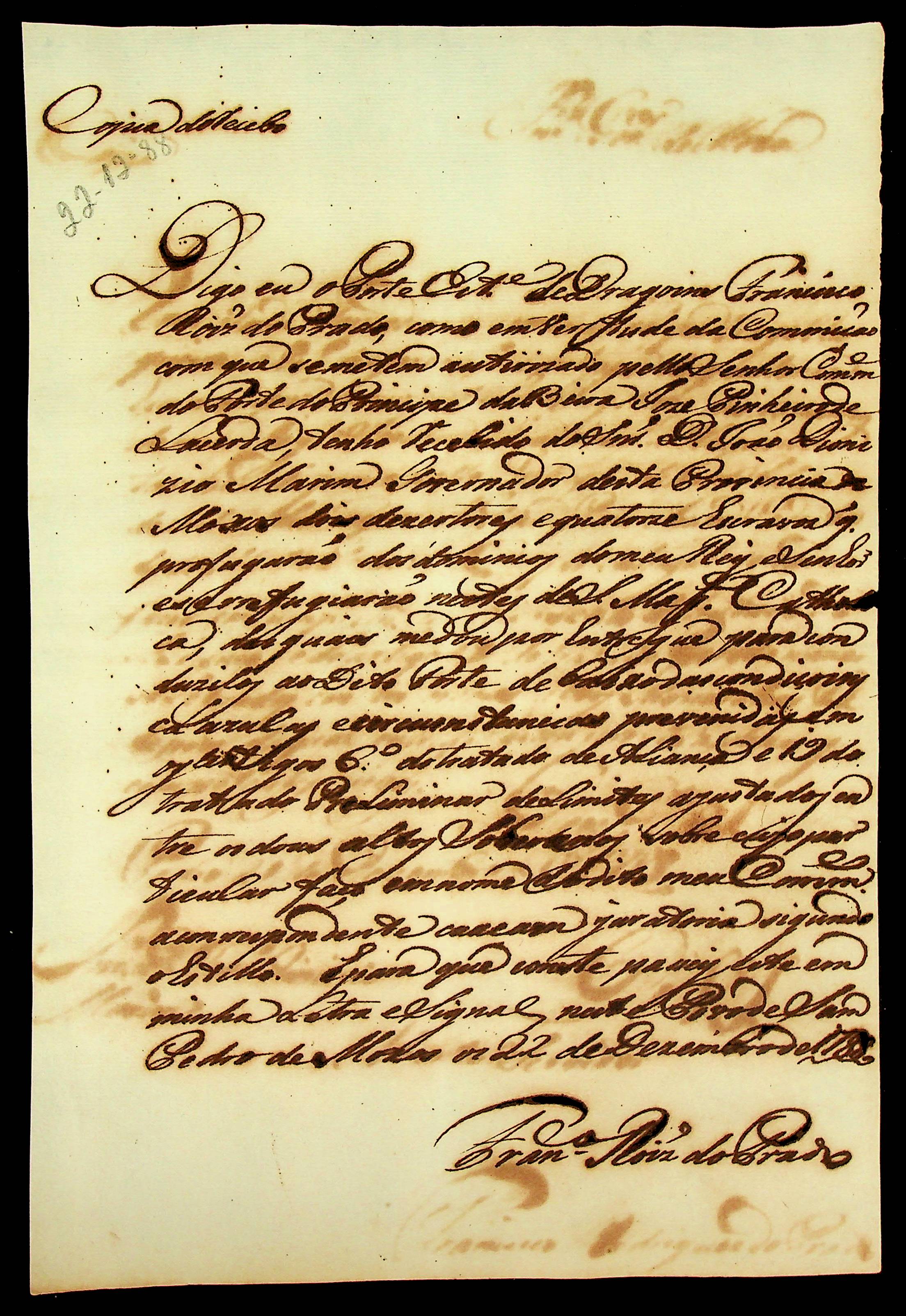 CARTA (cópia) do [Porta-Estandarte de Dragões] Francisco Rodrigues do Prado ao Governador de Moxos D. João Dionízio Marim.