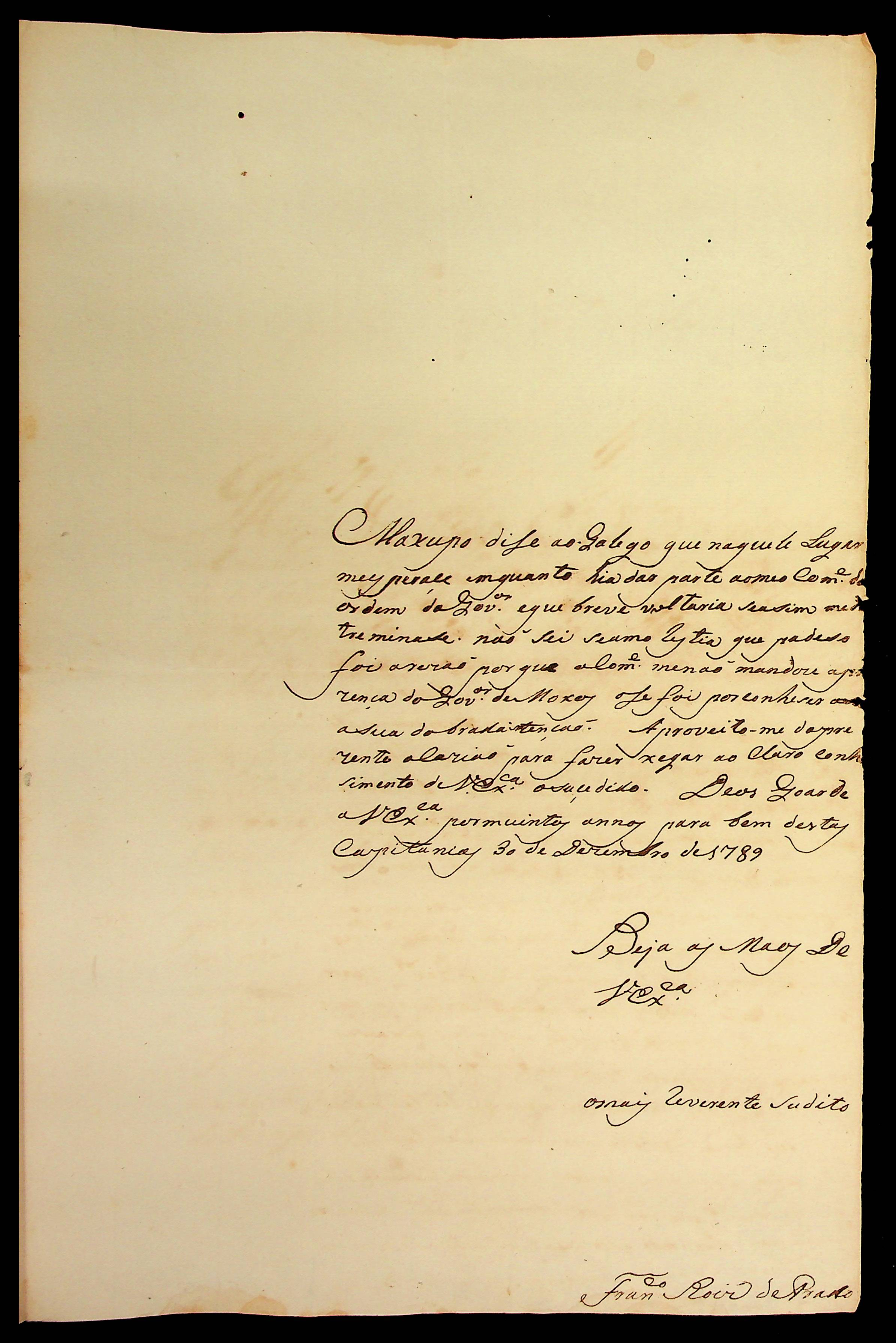CARTA do [Furriel da Companhia de Dragões] Francisco Rodrigues do Prado ao [Governador e Capitão-General da Capitania Luiz de Albuquerque de Mello Pereira e Cáceres].
