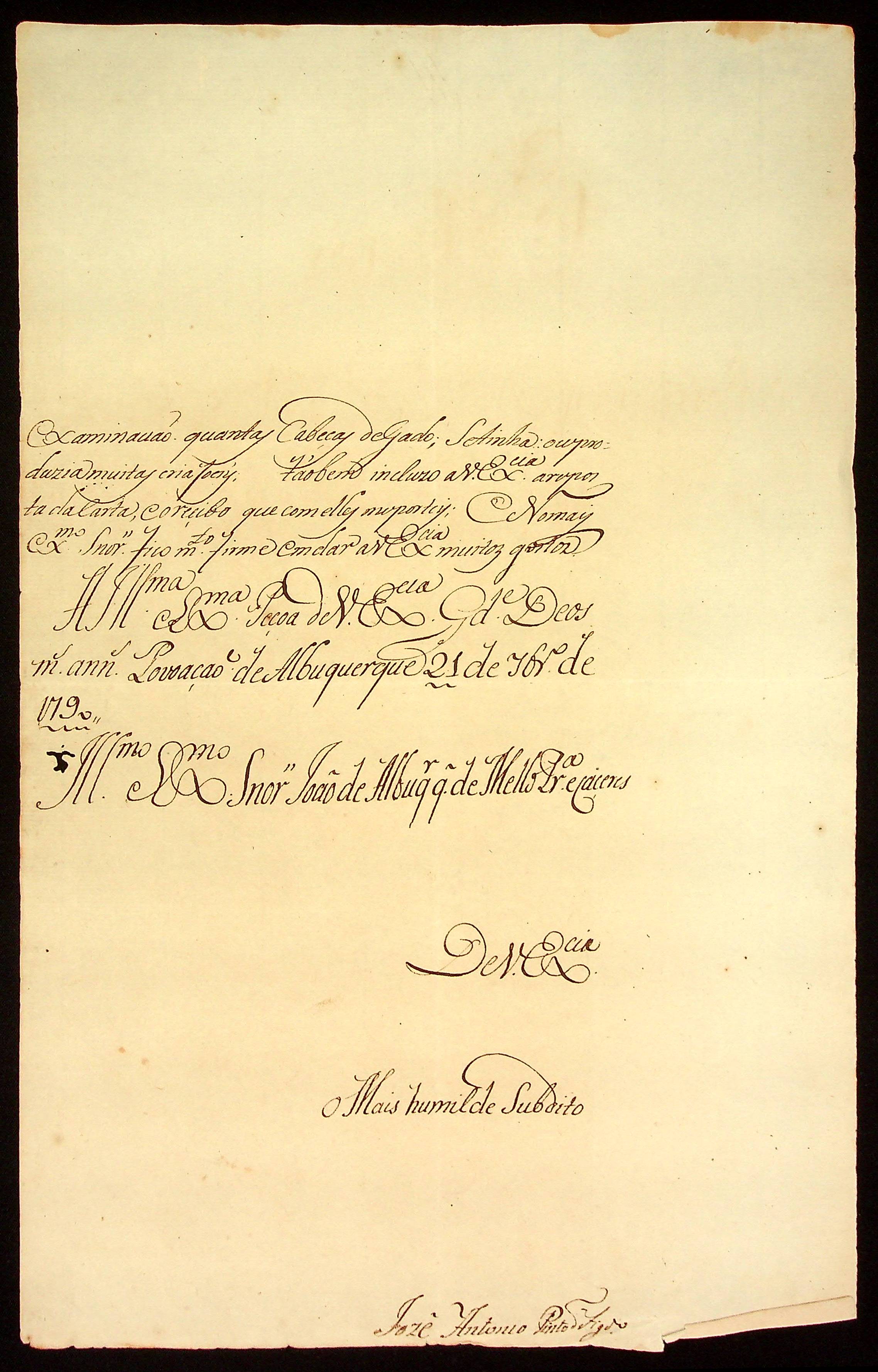CARTA do [Mestre de Campo] Antônio José Pinto de Figueiredo ao [Governador e Capitão-General da Capitania de Mato Grosso] João de Albuquerque de Mello Pereira e Cáceres.