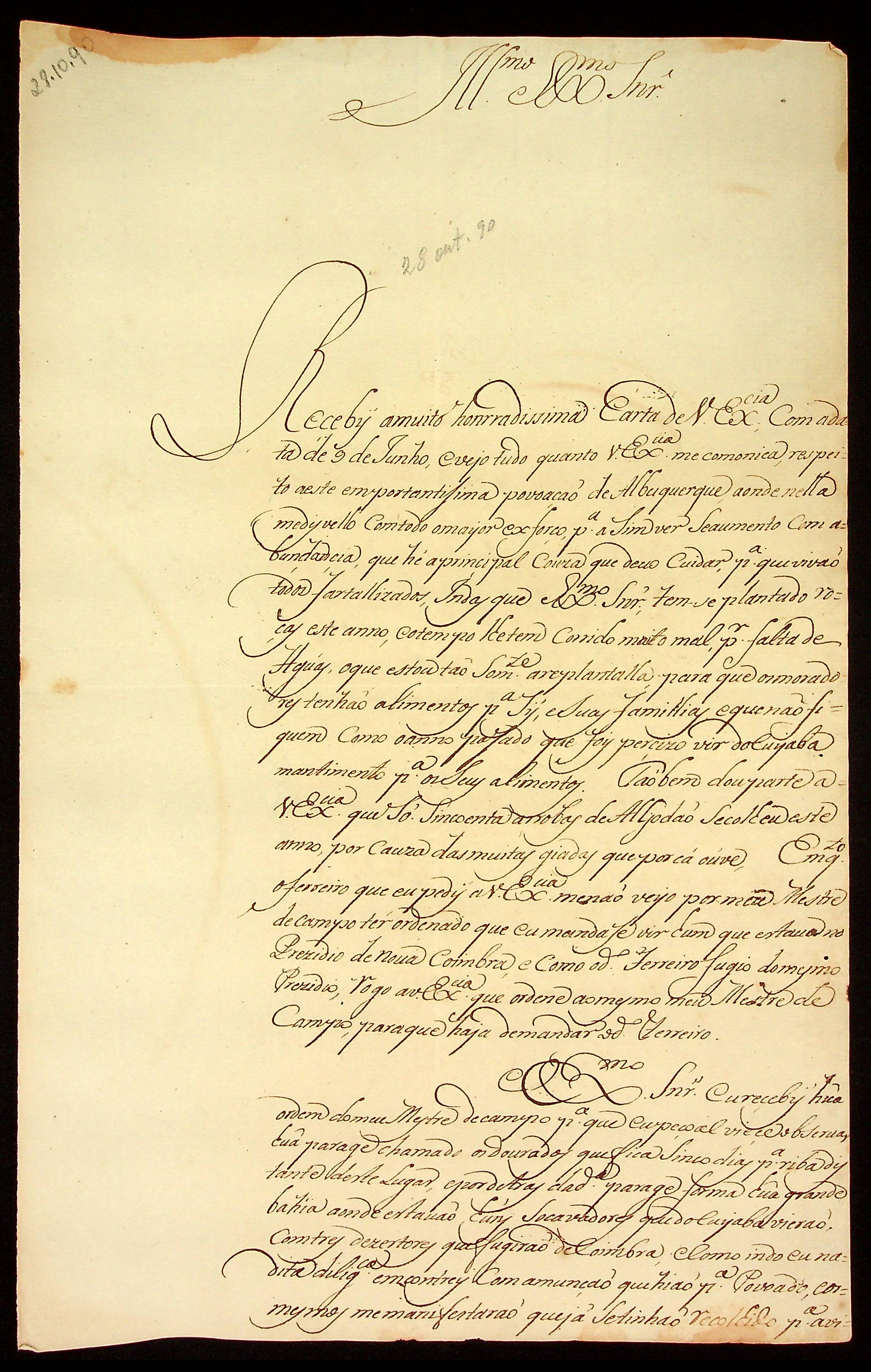 CARTA do Capitão João José Guimarães ao Mestre de Campo Antônio José Pinto de Figueiredo.