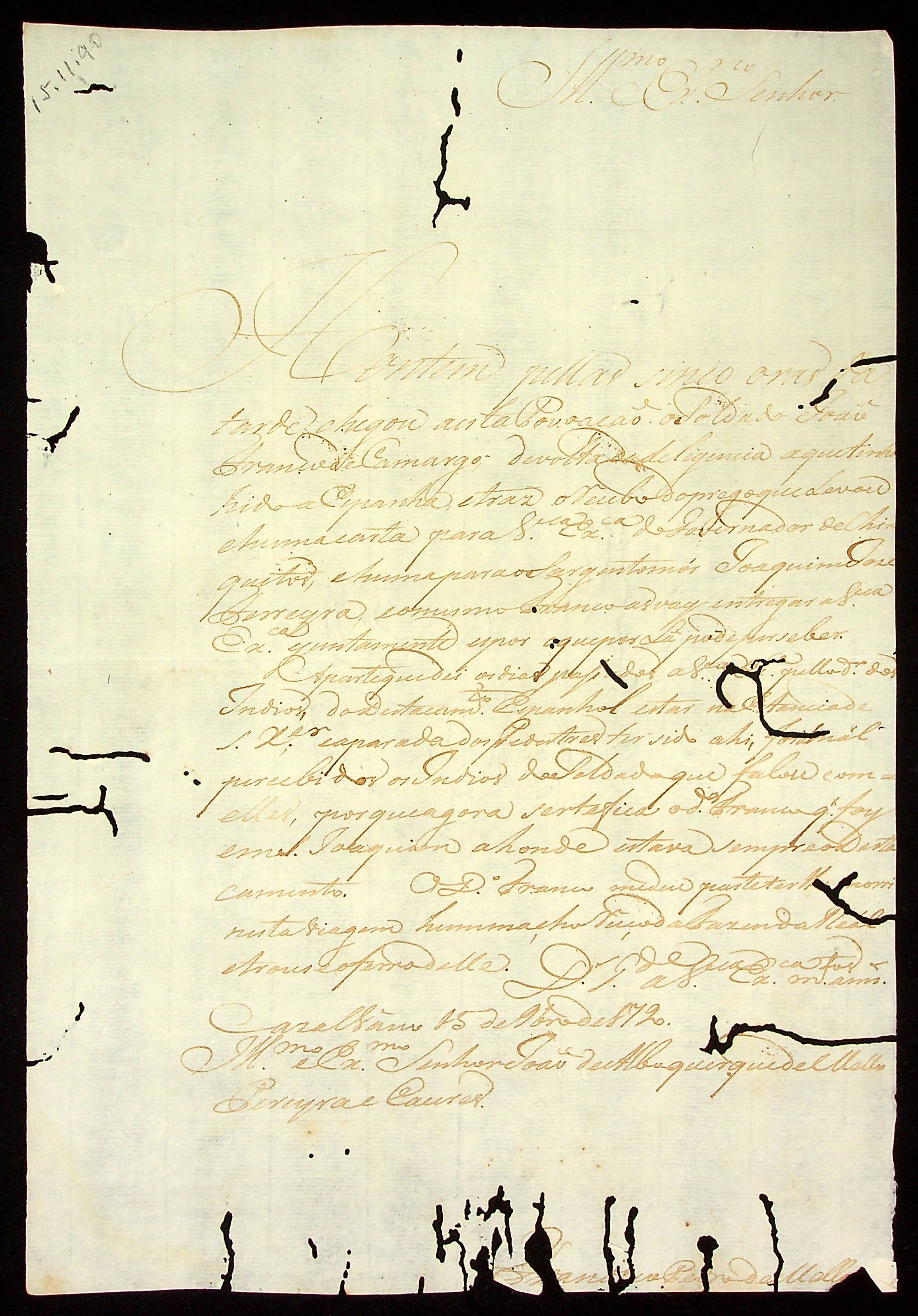 CARTA de Joaquim José Pereira ao [Governador e Capitão-General da Capitania de Mato Grosso] João de Albuquerque de Mello Pereira e Cáceres.