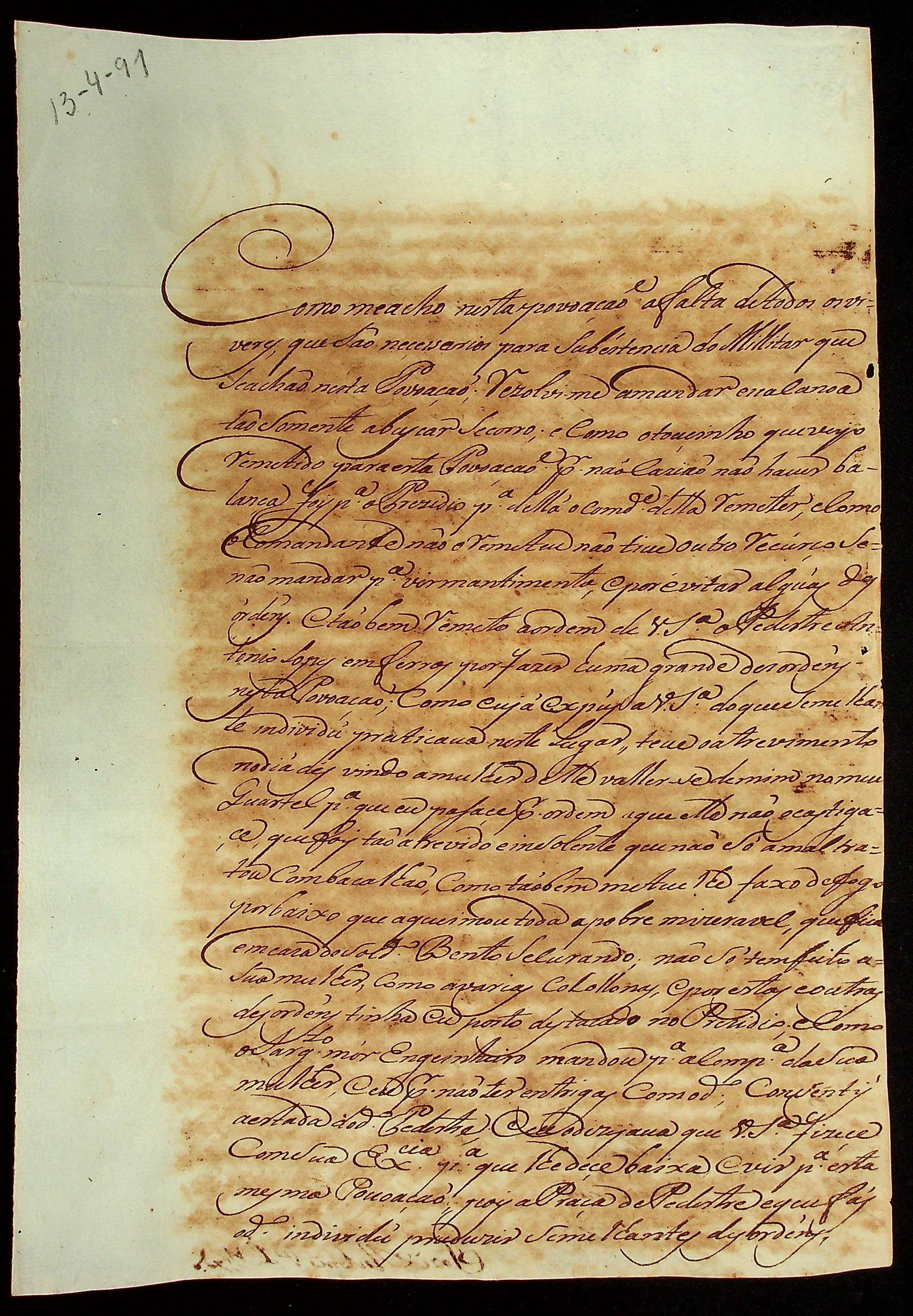 CARTA de Francisco Pedro de Melo ao [Governador e Capitão-General da Capitania de Mato Grosso] João de Albuquerque de Mello Pereira e Cáceres.