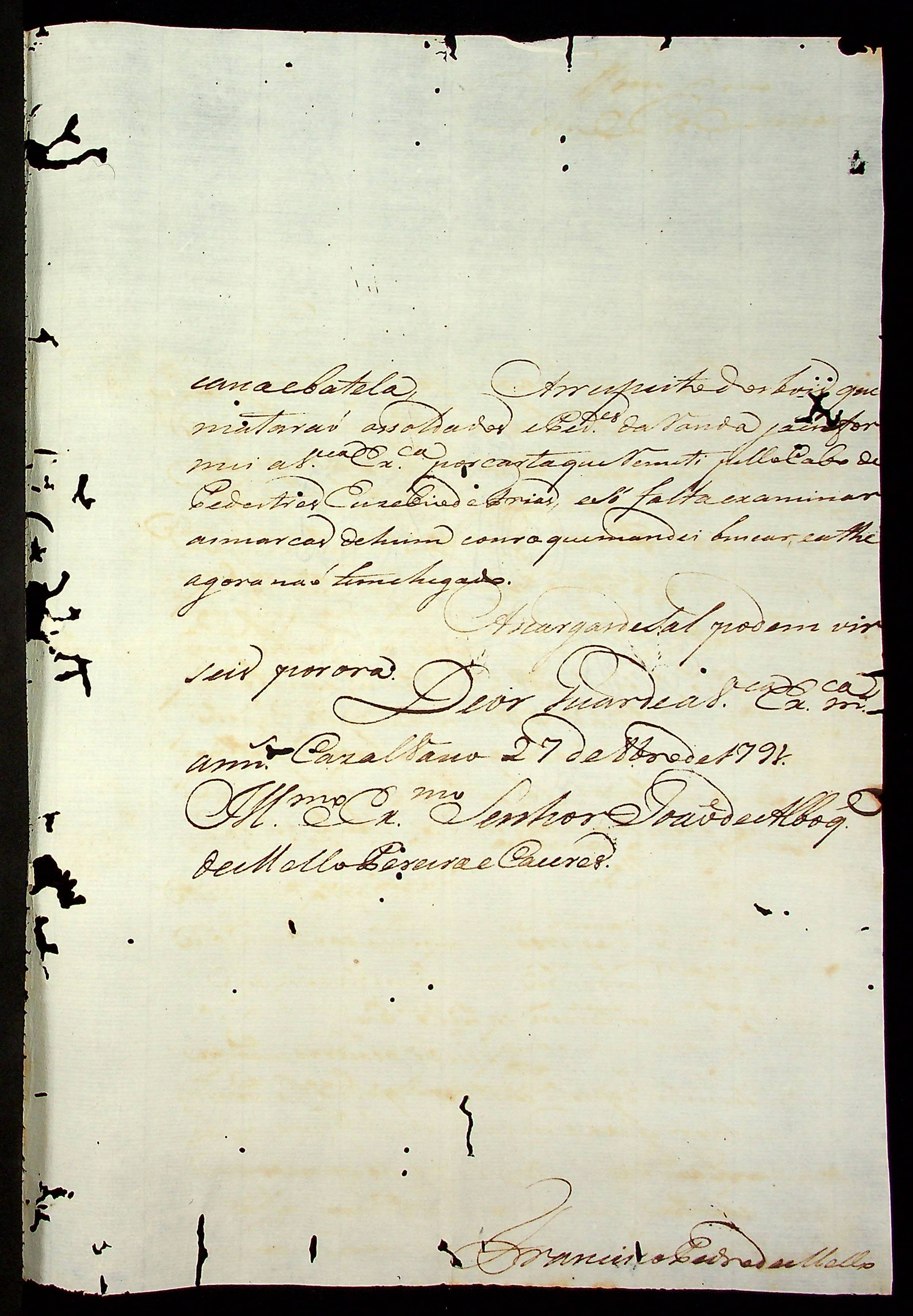 CARTA do [Mestre de Campo Antônio] José Pinto de Figueiredo ao [Governador e Capitão-General da Capitania de Mato Grosso] João de Albuquerque de Mello Pereira e Cáceres.