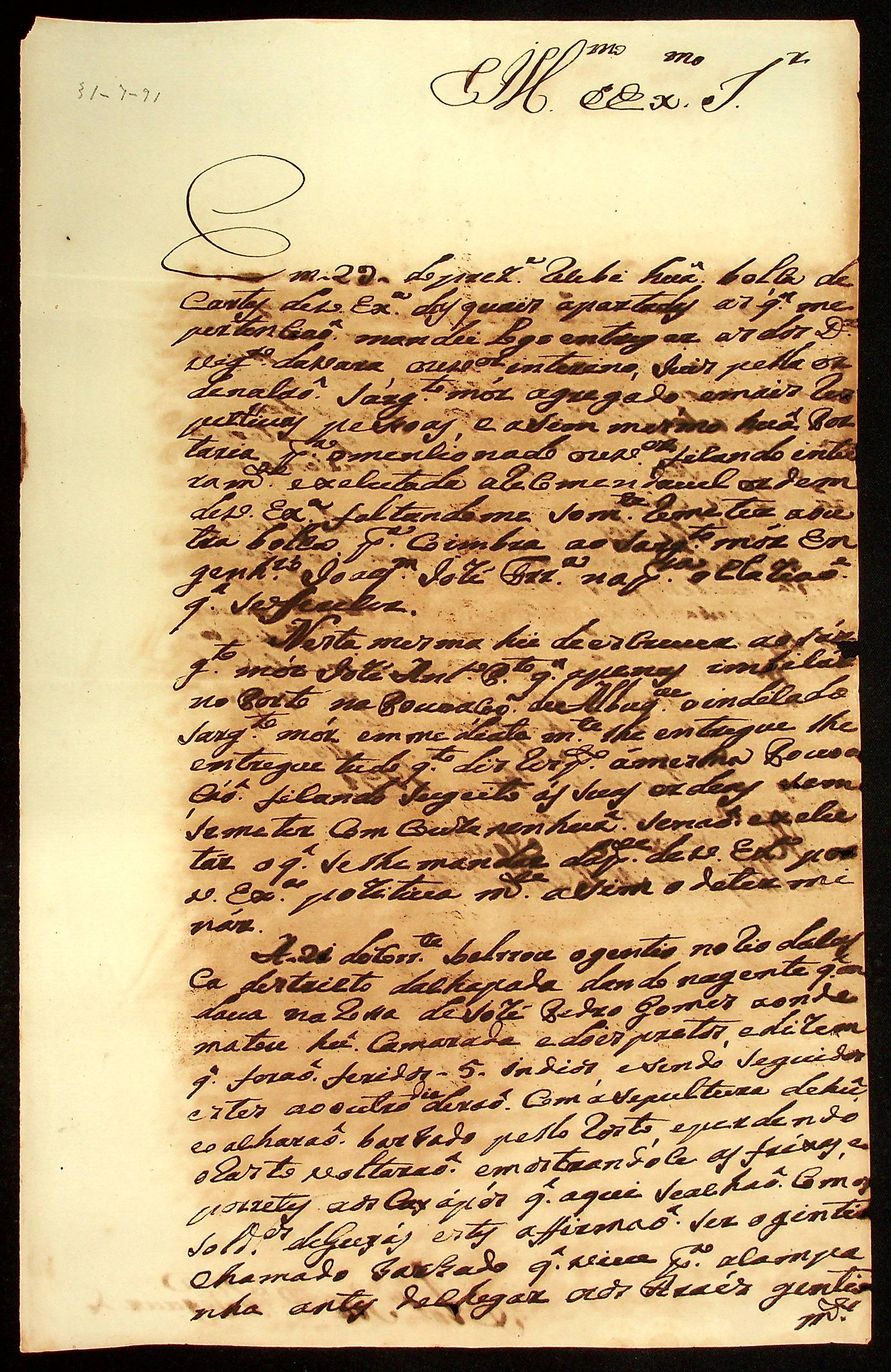 CARTA do Comandante] José Antônio Pinto de Figueiredo ao [Governador e Capitão-General de Mato Grosso] João de Albuquerque de Mello Pereira e Cáceres.