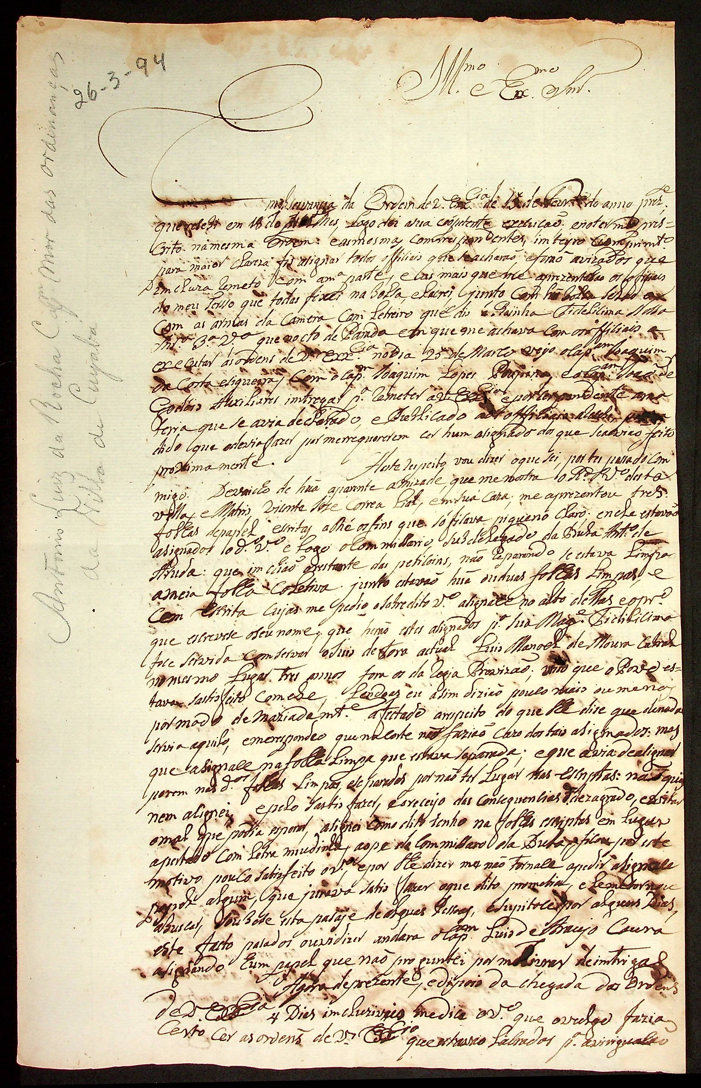 CARTA do Capitão das Ordenanças Antônio Luiz da Rocha ao [Governador e Capitão-General da Capitania de Mato Grosso] João de Albuquerque de Mello Pereira e Cáceres.