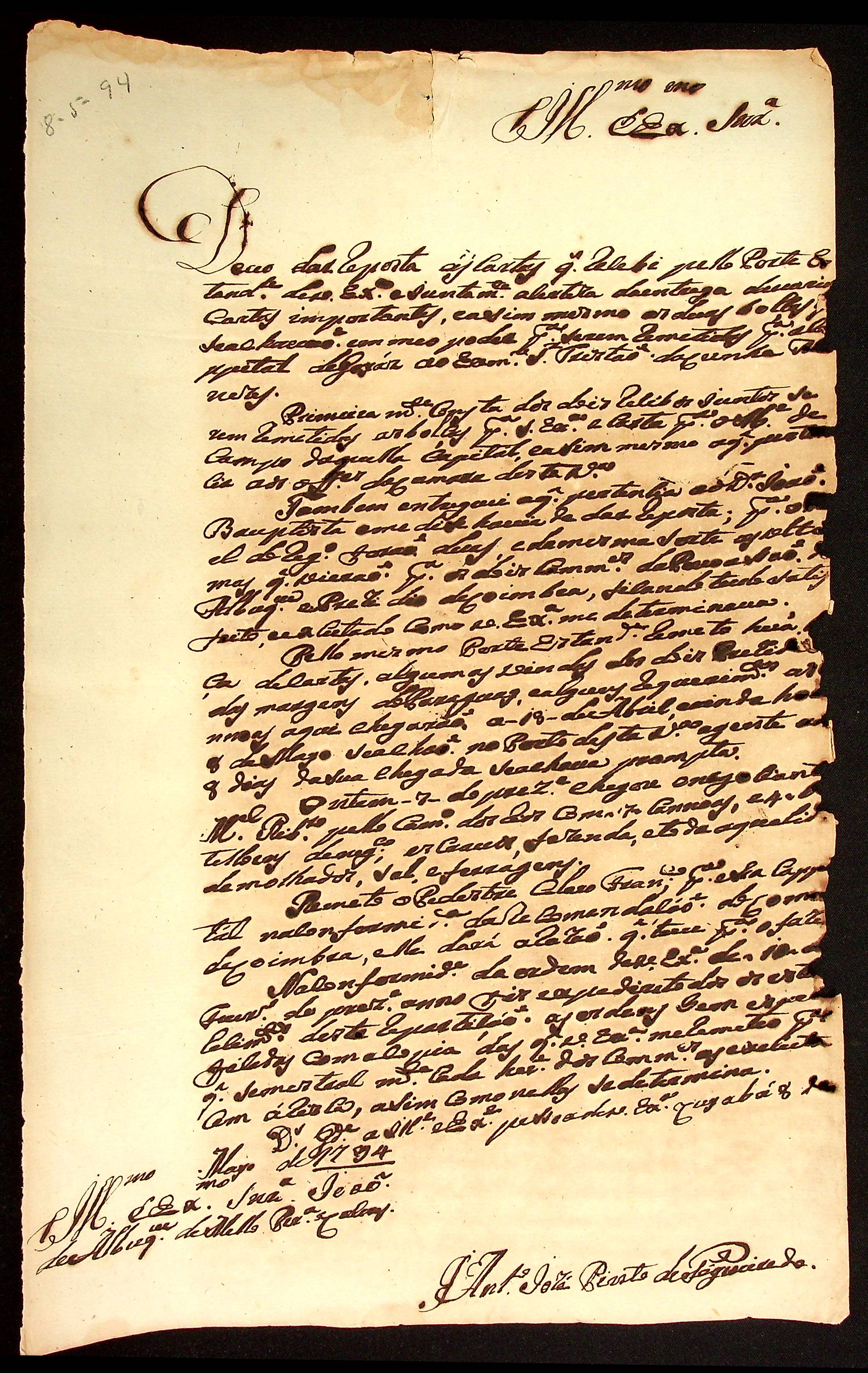 CARTA do [Mestre de Campo] Antônio José Pinto de Figueiredo ao [Governador e Capitão-General da Capitania de Mato Grosso] João de Albuquerque de Mello Pereira e Cáceres.