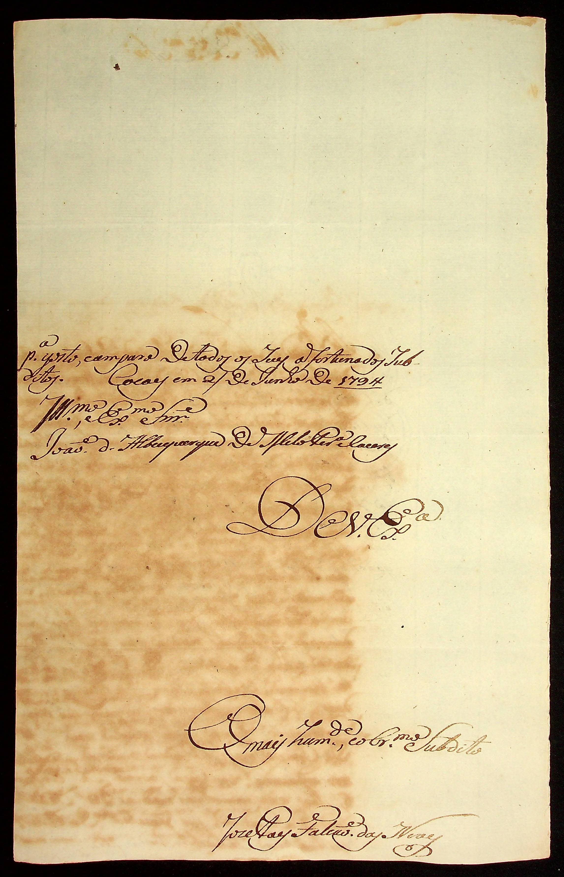 CARTA do [Sargento-mor da Ordenança] José Paes Falcão das Neves ao [Governador e Capitão-General da Capitania de Mato Grosso] João de Albuquerque de Mello Pereira e Cáceres.