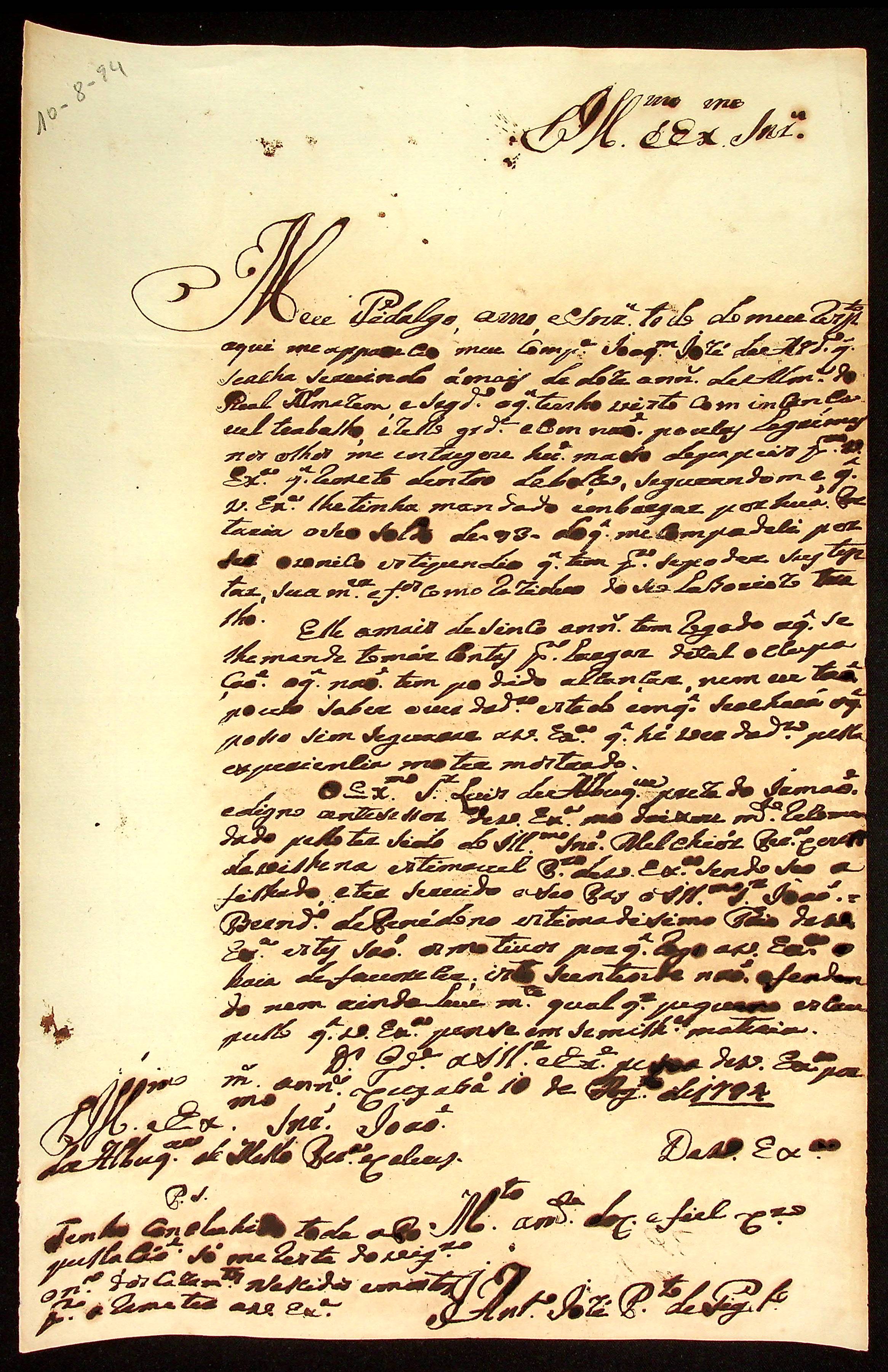 CARTA do [Mestre de Campo] Antônio José Pinto de Figueiredo ao [Governador e Capitão-General da Capitania de Mato Grosso] João de Albuquerque de Mello Pereira e Cáceres.