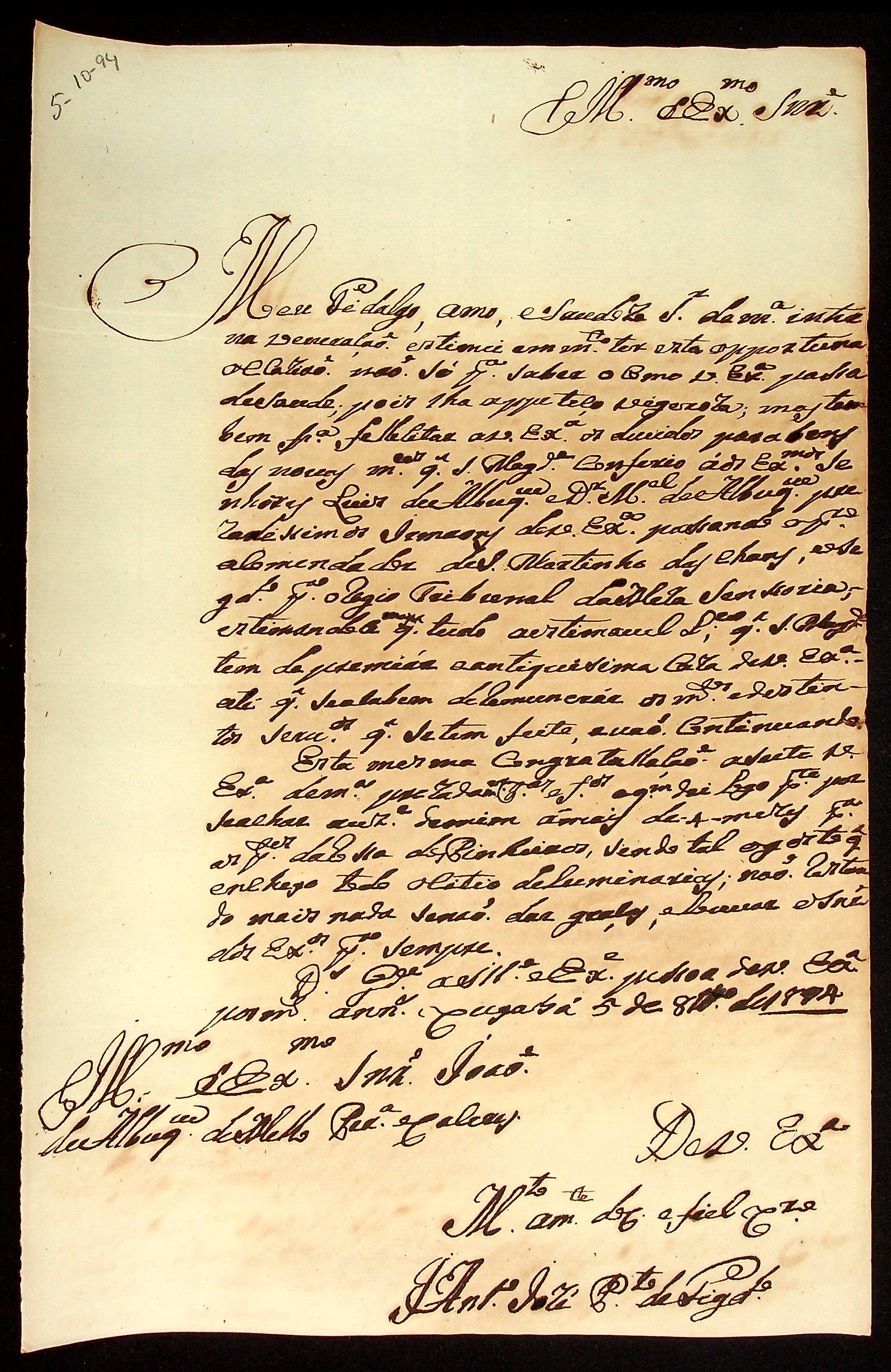 CARTA do [Mestre de Campo] Antônio José Pinto de Figueiredo ao [Governador e Capitão-General da Capitania de Mato Grosso] Antônio José Pinto de Figueiredo.