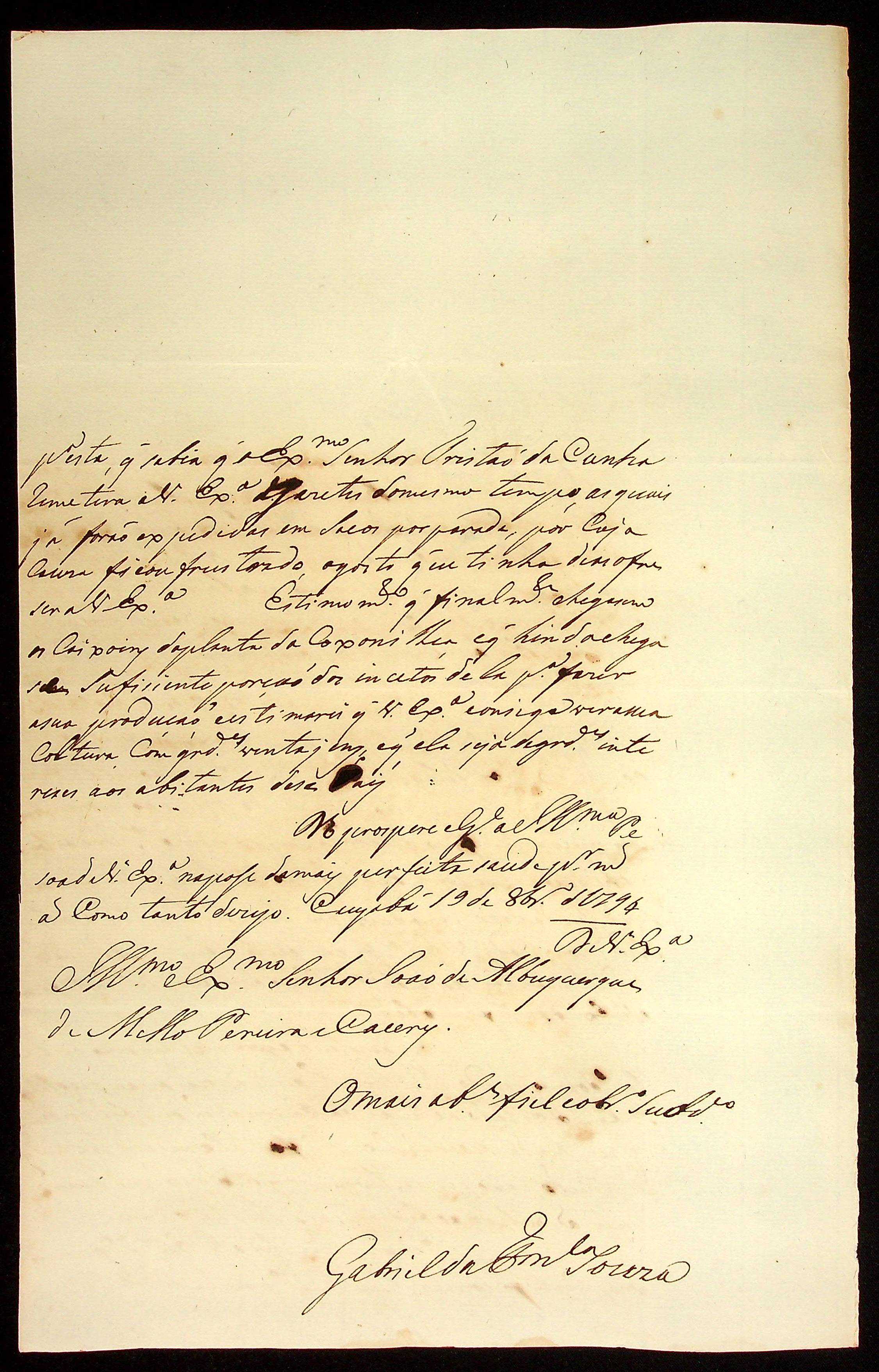 CARTA de Gabriel da [Fonseca] e Sousa ao [Governador e Capitão-General da Capitania de Mato Grosso] Joãode Albuquerque de Mello Pereira e Cáceres.