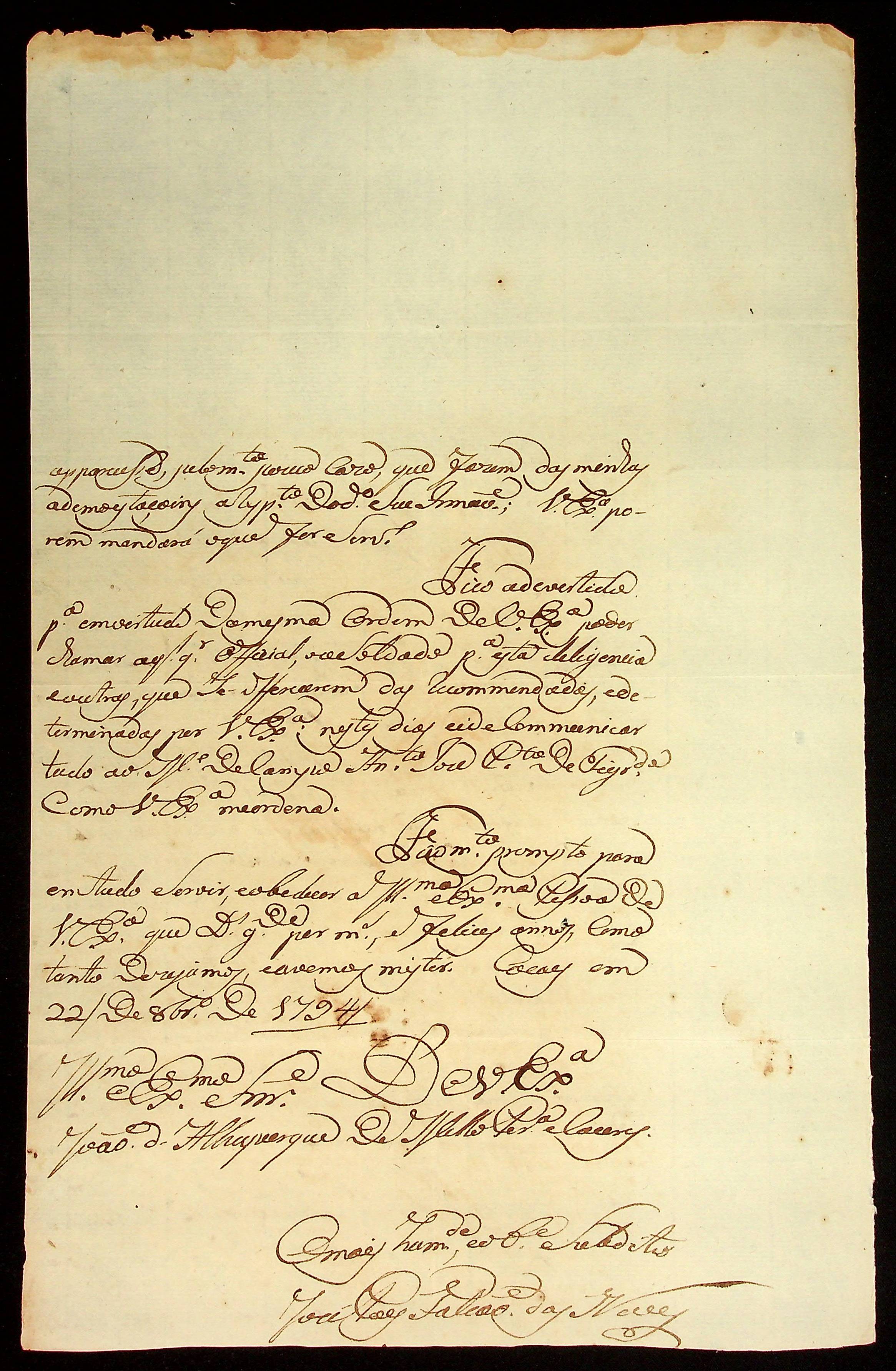 CARTA do [Mestre de Campo] José Paes das Falcão Neves ao [Governador e Capitão-General da Capitania de Mato Grosso] João de Albuquerque de Mello Pereira e Cáceres.