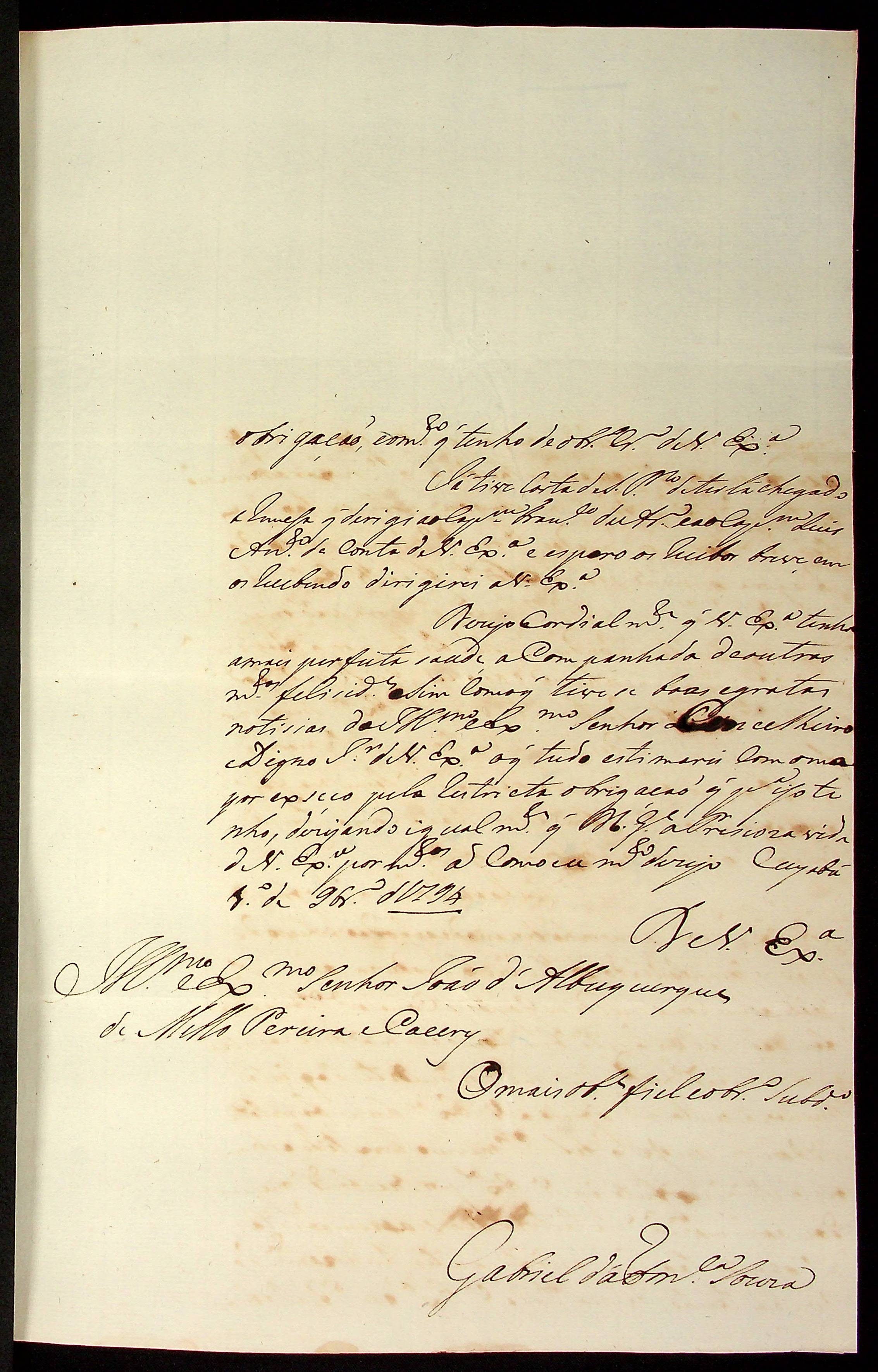 CARTA do [Sargento-mor] Gabriel da [Fonseca] e Sousa ao Governador e Capitão-General da Capitania de Mato Grosso João de Albuquerque de Mello Pereira e Cáceres.