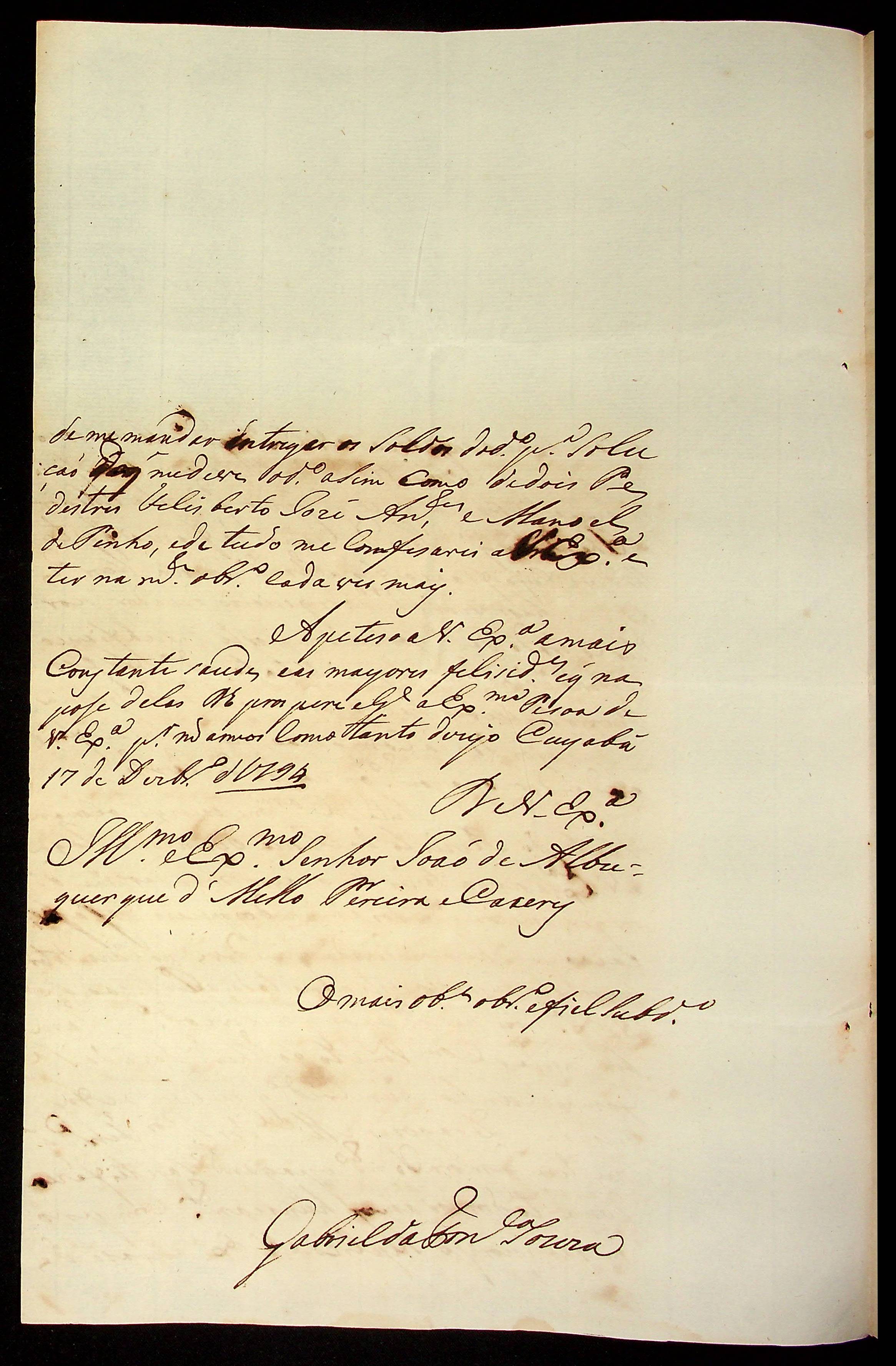 CARTA de [Sargento-mor] Gabriel da Fonseca e Sousa ao [Governador e Capitão-General da Capitania de Mato Grosso] João de Albuquerque de Mello Pereira e Cáceres.