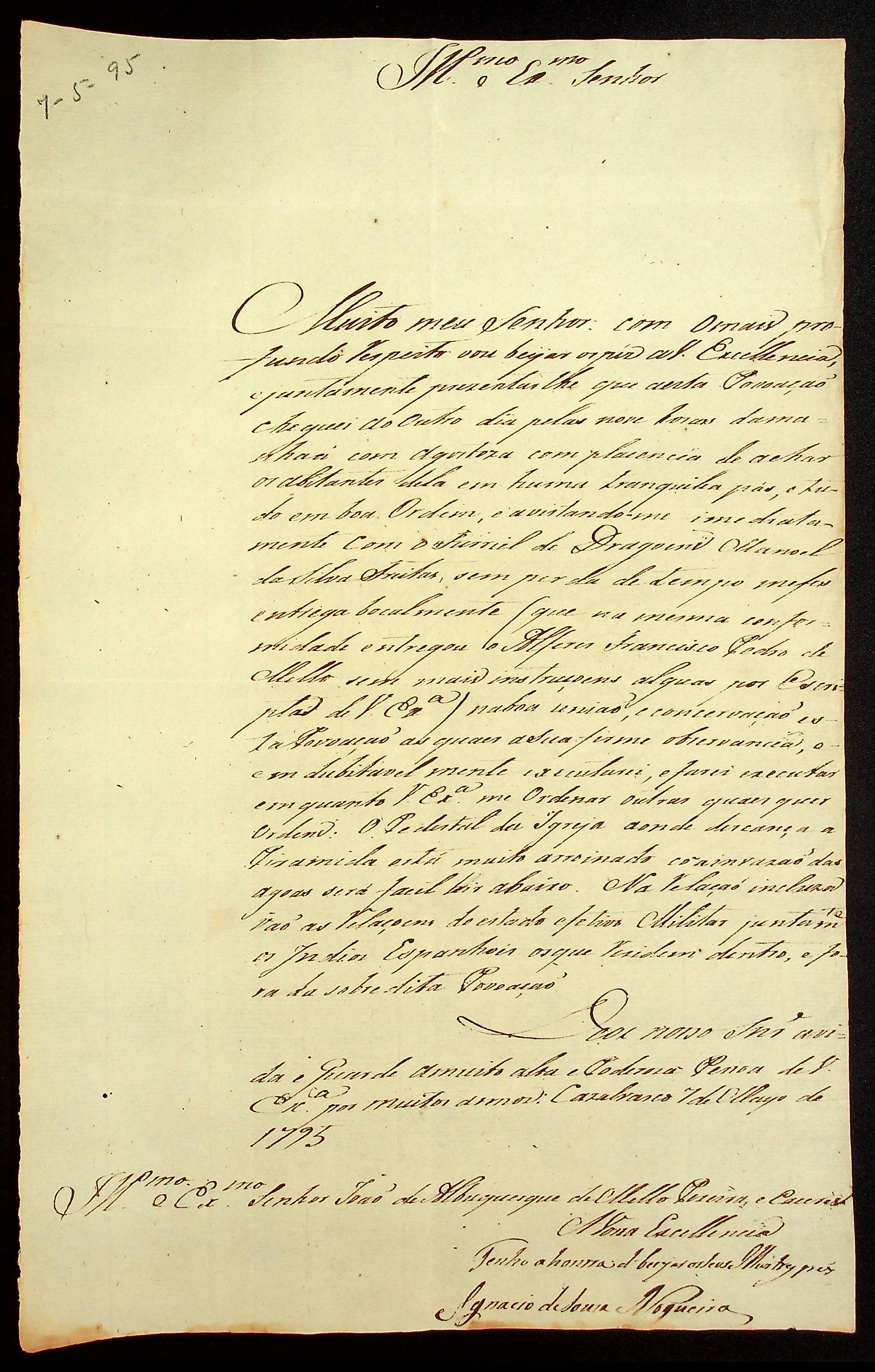 CARTA de Ignacio de Souza Nogueira ao [Governador e Capitão-General de Mato Grosso] João de Albuquerquede Mello Pereira e Cáceres.