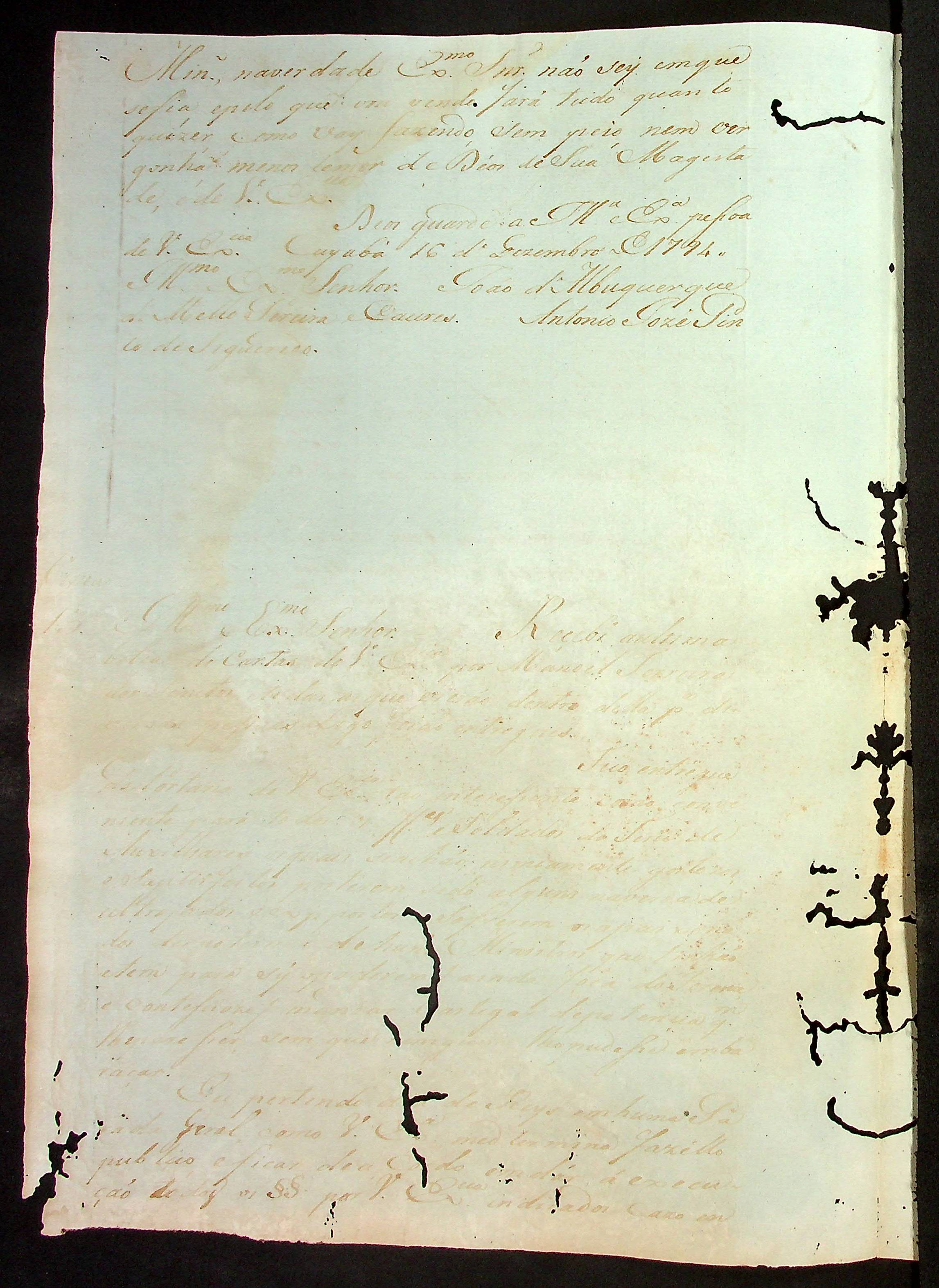 CARTA (cópia/conjunta) do [Mestre de Campo] Antônio José Pinto de Figueiredo ao [Governador e Capitão-General da Capitania de Mato Grosso] João de Albuquerque de Mello Pereira e Cáceres.