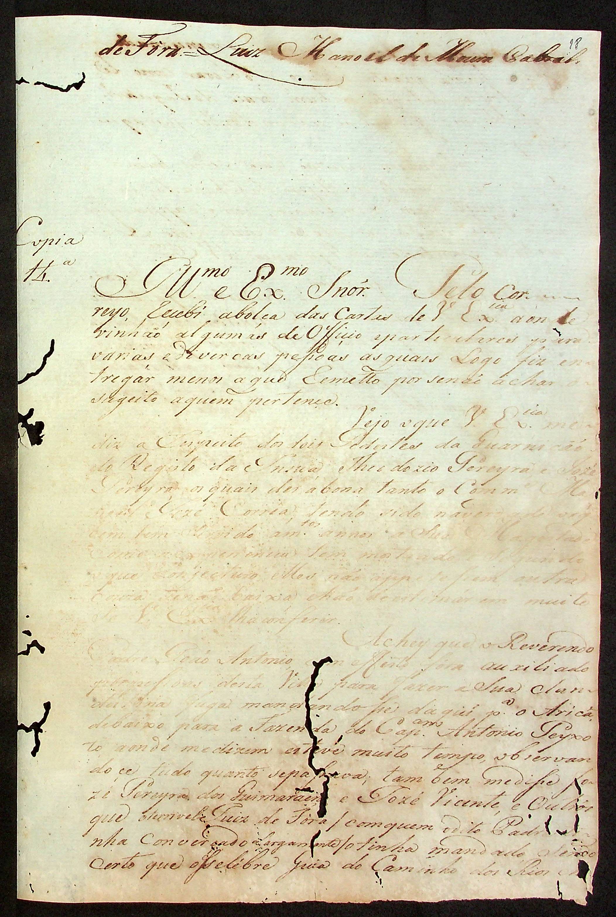 CARTA (cópia/conjunta) do [Mestre de Campo] Antônio José Pinto de Figueiredo ao [Governador e Capitão-General da Capitania de Mato Grosso] João de Albuquerque de Mello Pereira e Cáceres.