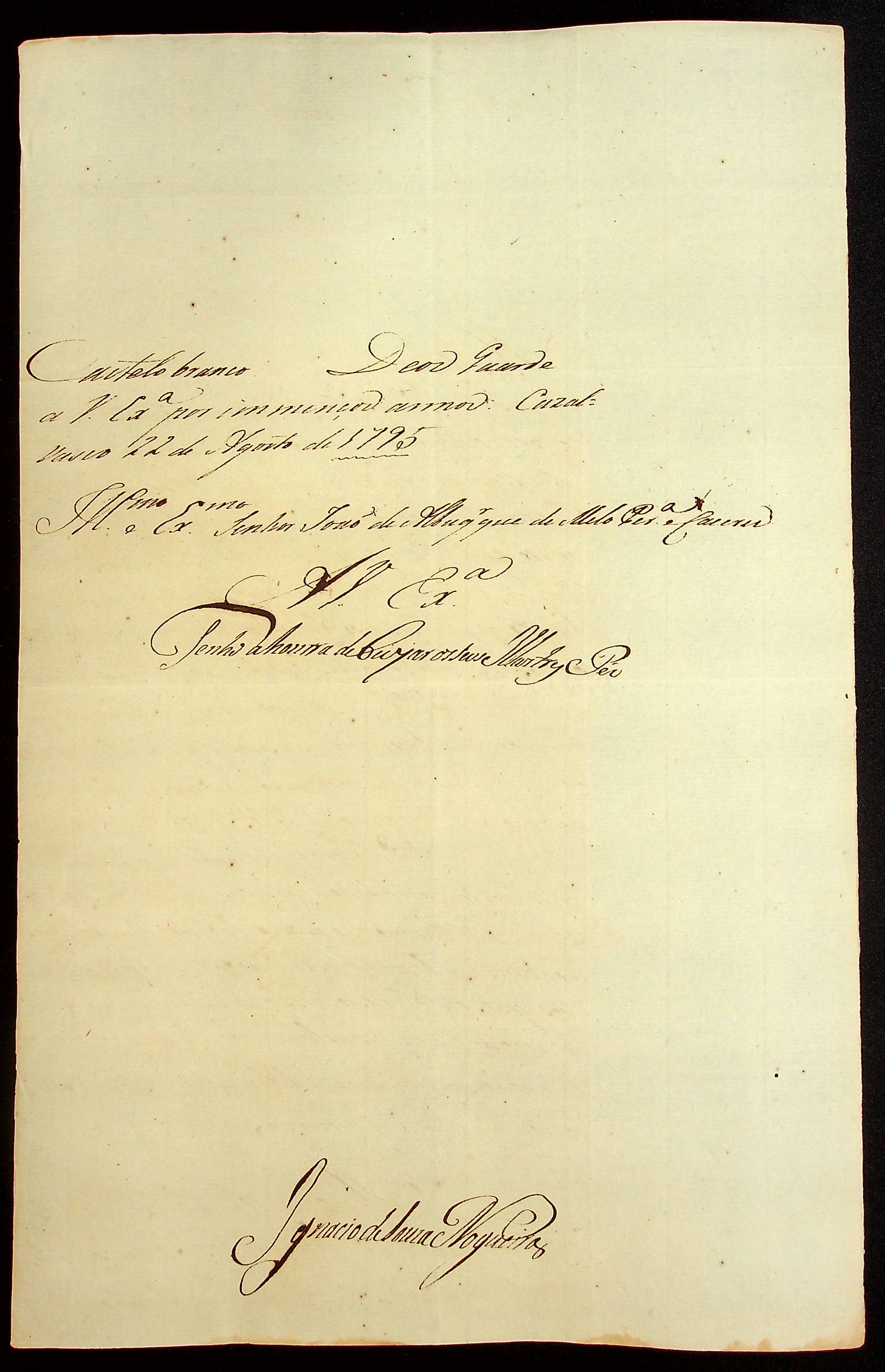 CARTA de Ignácio de Souza Nogueira ao [Governador e Capitão-General de Mato Grosso] João de Albuquerque de Mello Pereira e Cáceres.