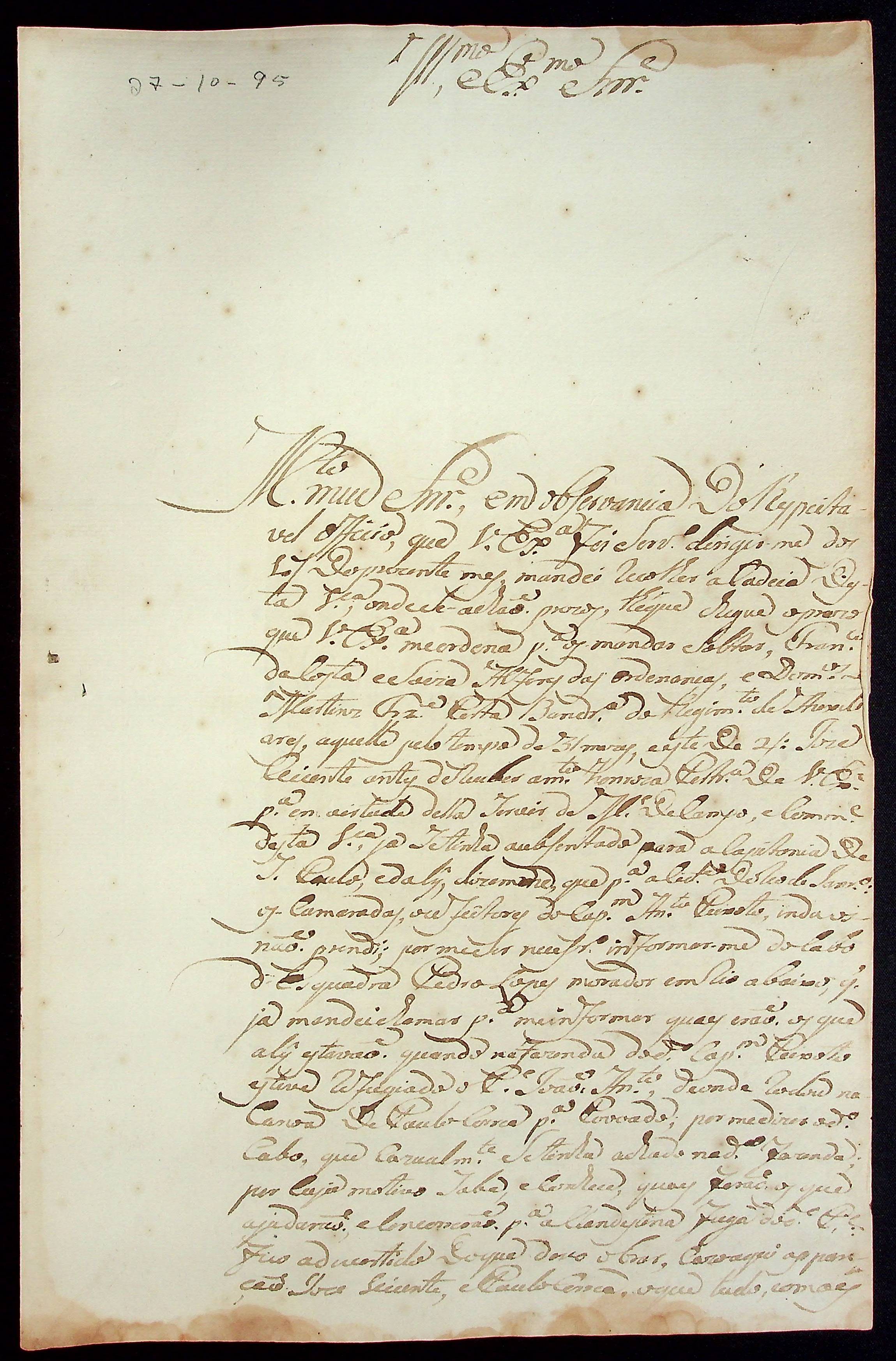 CARTA do [Mestre de Campo] José Paes Falcão das Neves ao [Governador e Capitão-General da Capitania de Mato Grosso] João de Albuquerque de Mello Pereira e Cáceres.