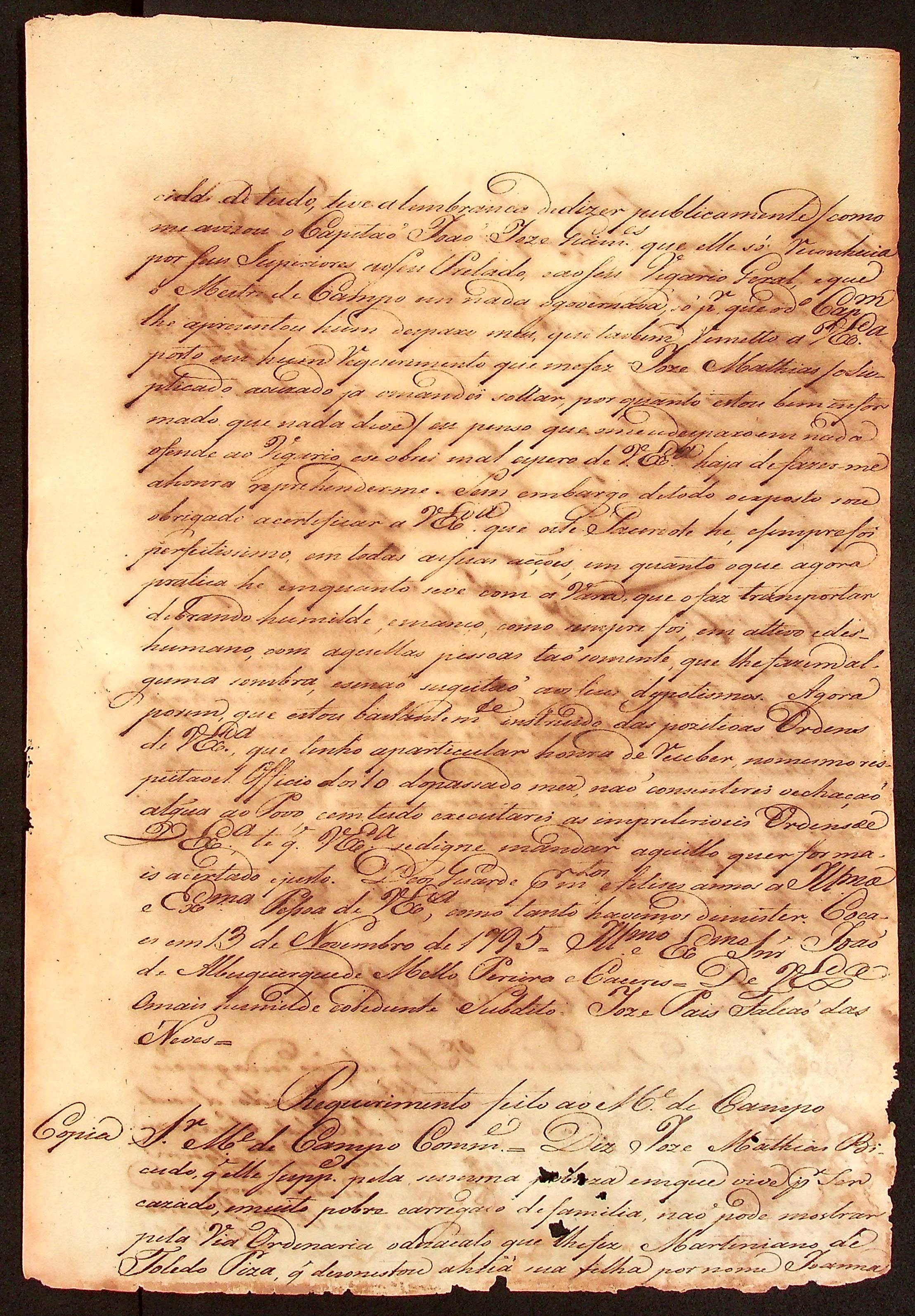 CARTA (cópia) do [Mestre de Campo] José Paes Falcão das Neves ao [Governador e Capitão-General da Capitania de Mato Grosso] João de Albuquerque de Mello Pereira e Cáceres.