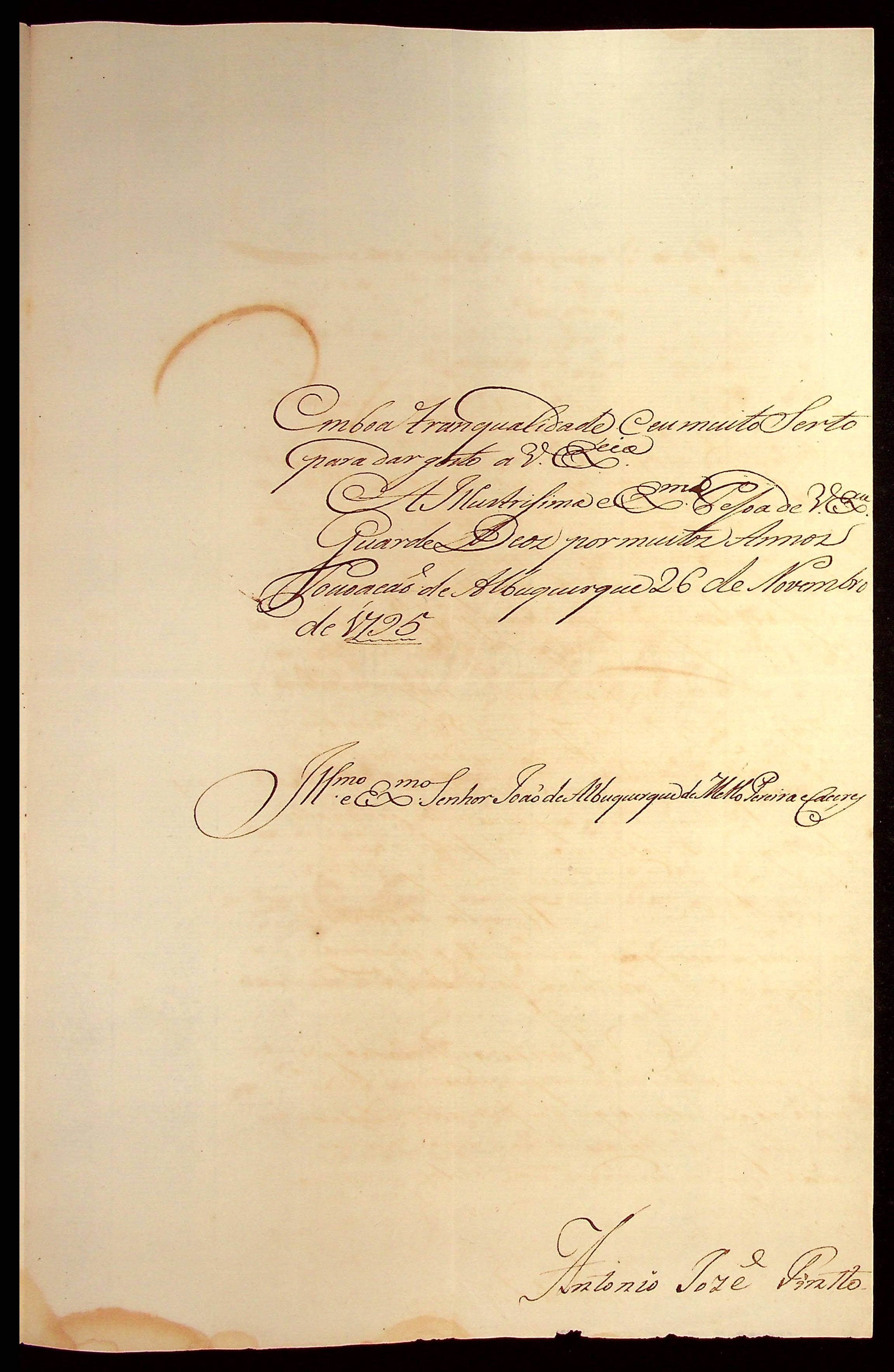 CARTA do [Comandante da povoação de Albuquerque] Antônio José Pinto de Figueiredo ao [Governador e Capitão-General da Capitania de Mato Grosso] João de Albuquerque de Mello Pereira e Cáceres.