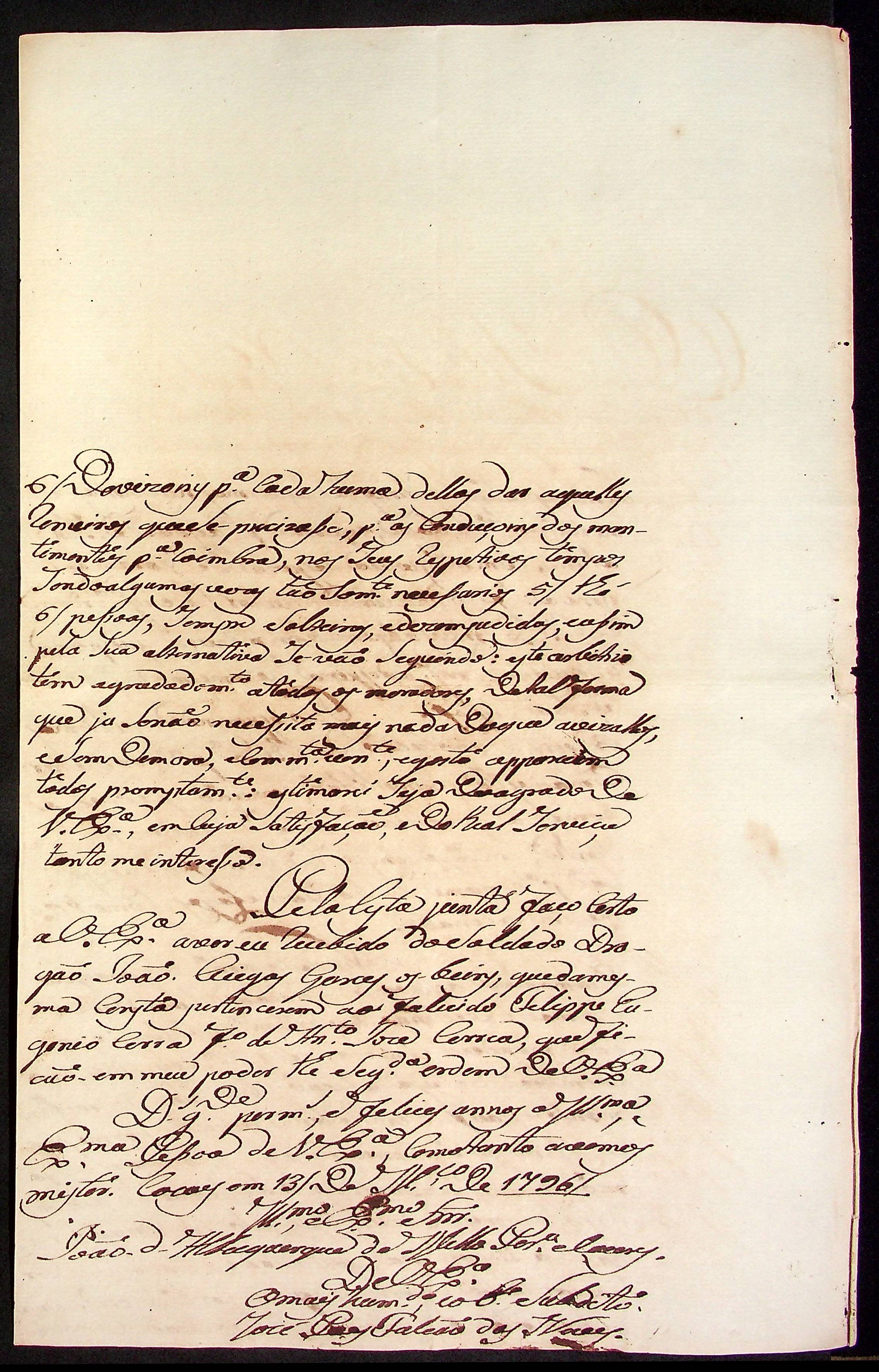 CARTA do [Mestre de Campo] José Paes Falcão das Neves ao [Governador e Capitão-General da Capitania de Mato Grosso] João de Albuquerque de Mello Pereira e Cáceres.