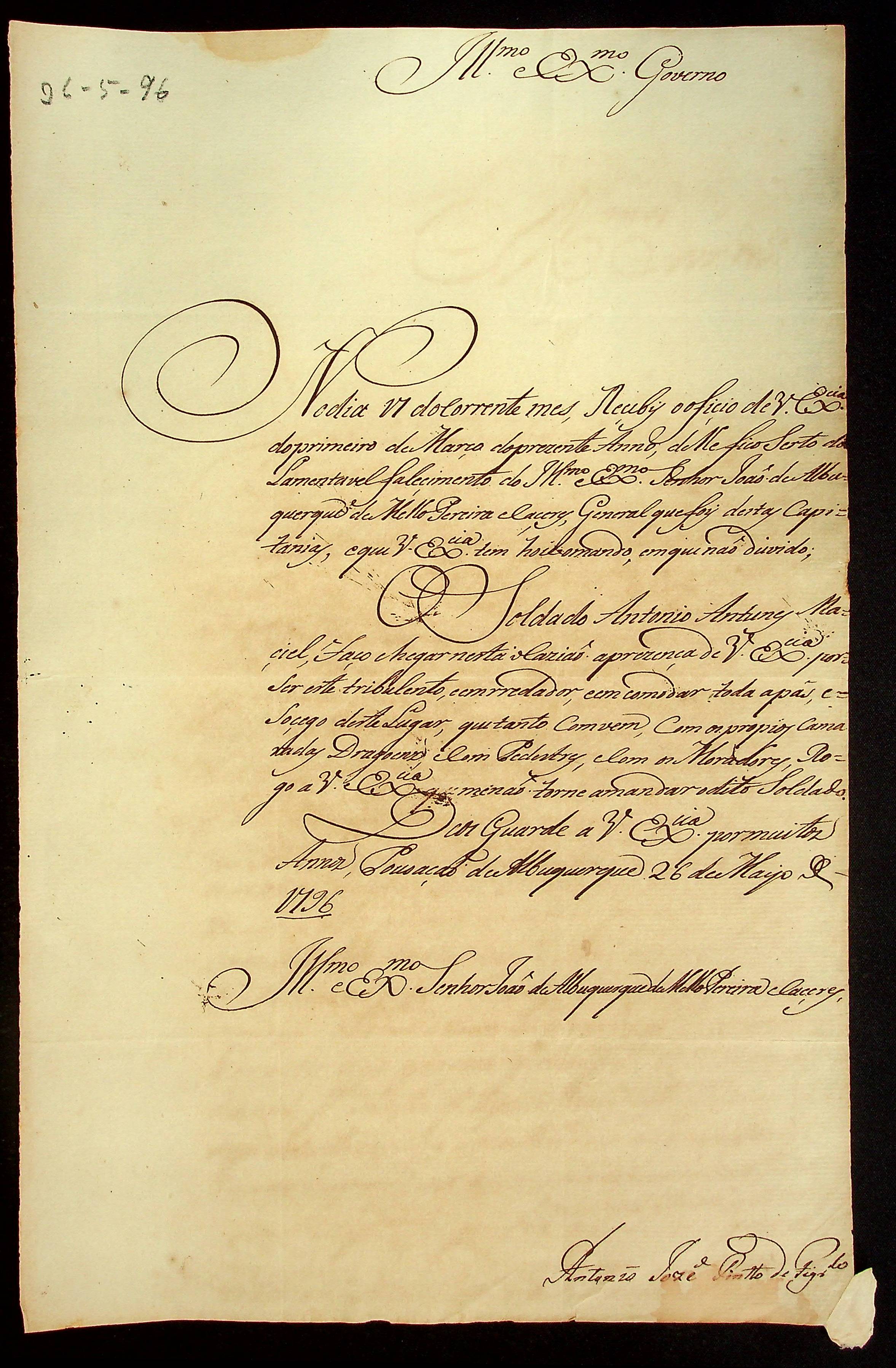 CARTA do [Mestre de Campo] Antônio José Pinto de Figueiredo ao Governador e [Capitão-General da Capitania de Mato Grosso] João de Albuquerque de Mello Pereira e Cáceres.