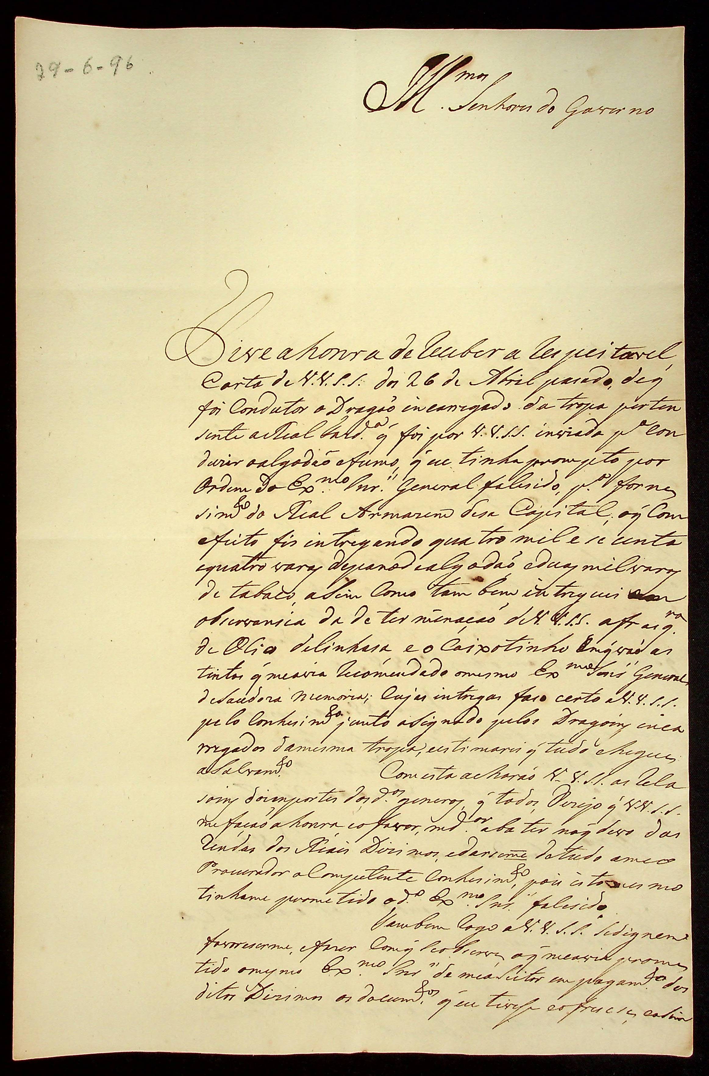 CARTA de Gabriel de Fonseca de Souza à [Primeira Junta Governativa da Capitania de Mato Grosso].