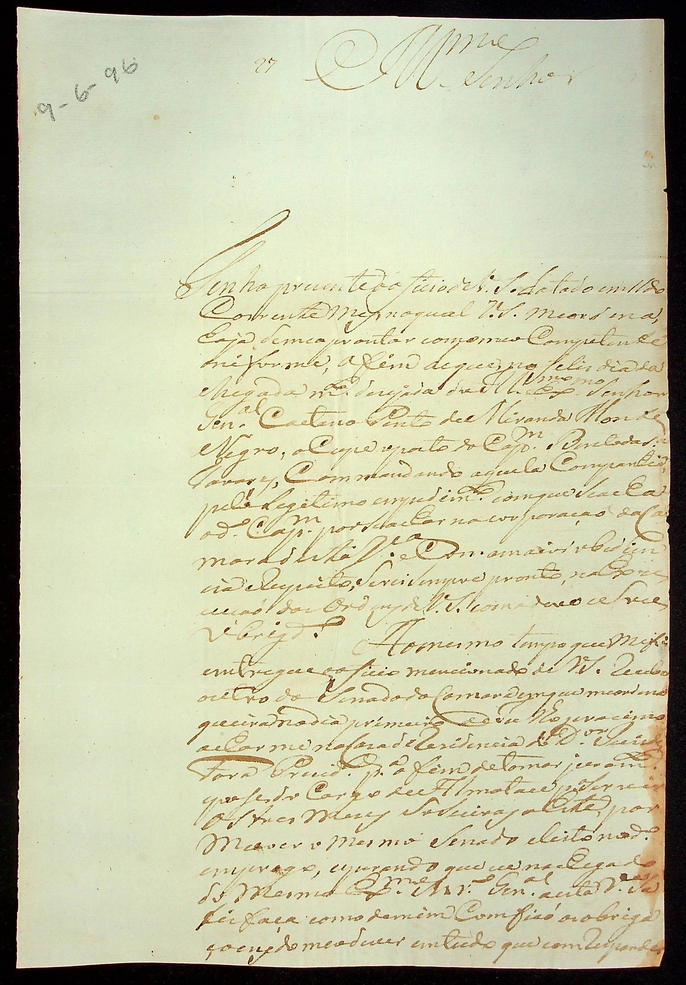 CARTA do Capitão Agregado da Legião Auxiliar Francisco Xavier da Silva Pereira ao Mestre de Campo e Comandante José Paes Falcão das Neves.