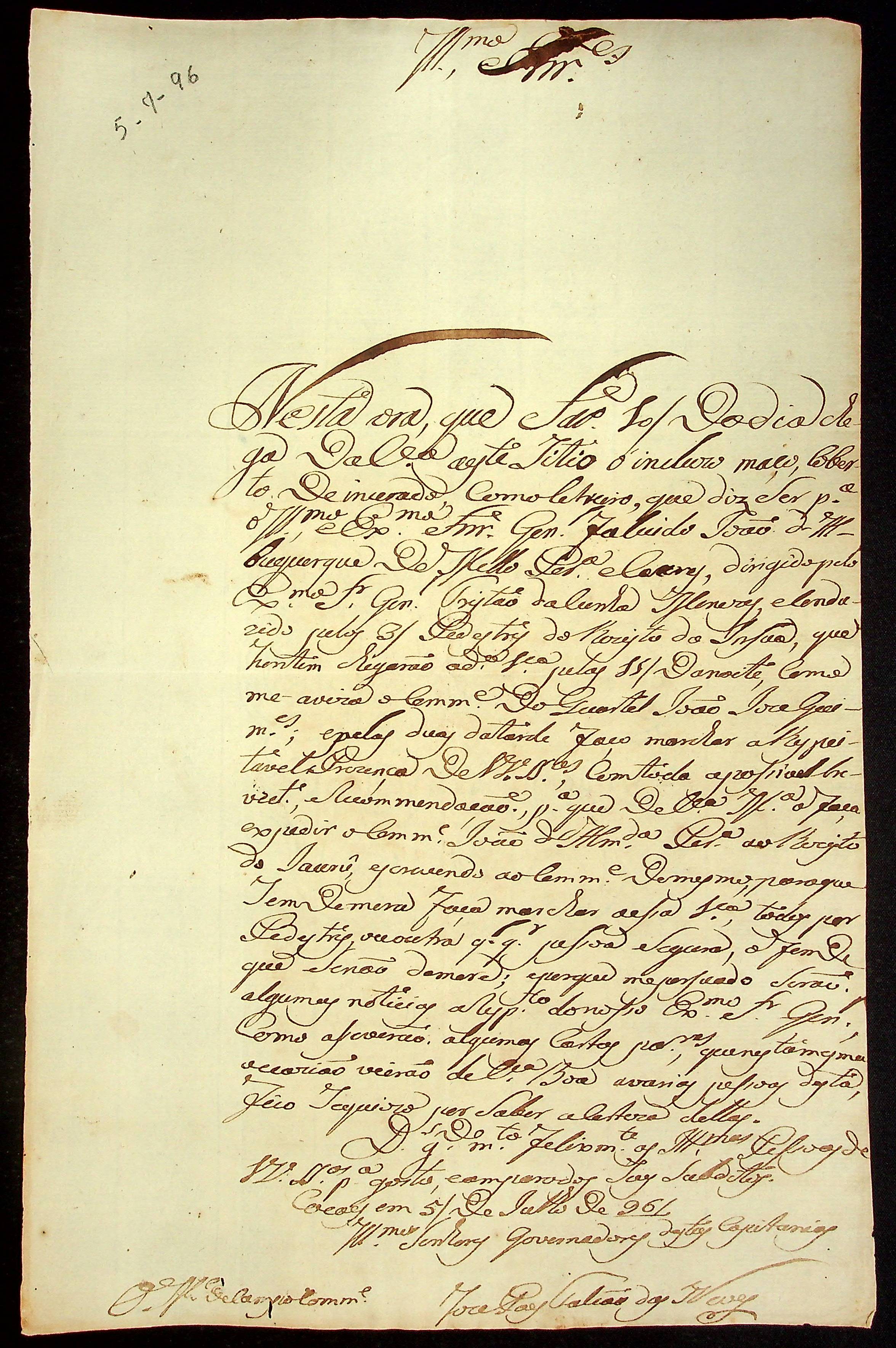CARTA do [Mestre de Campo] José Paes Falcão das Neves à [Primeira Junta Governativa da Capitania de Mato Grosso].