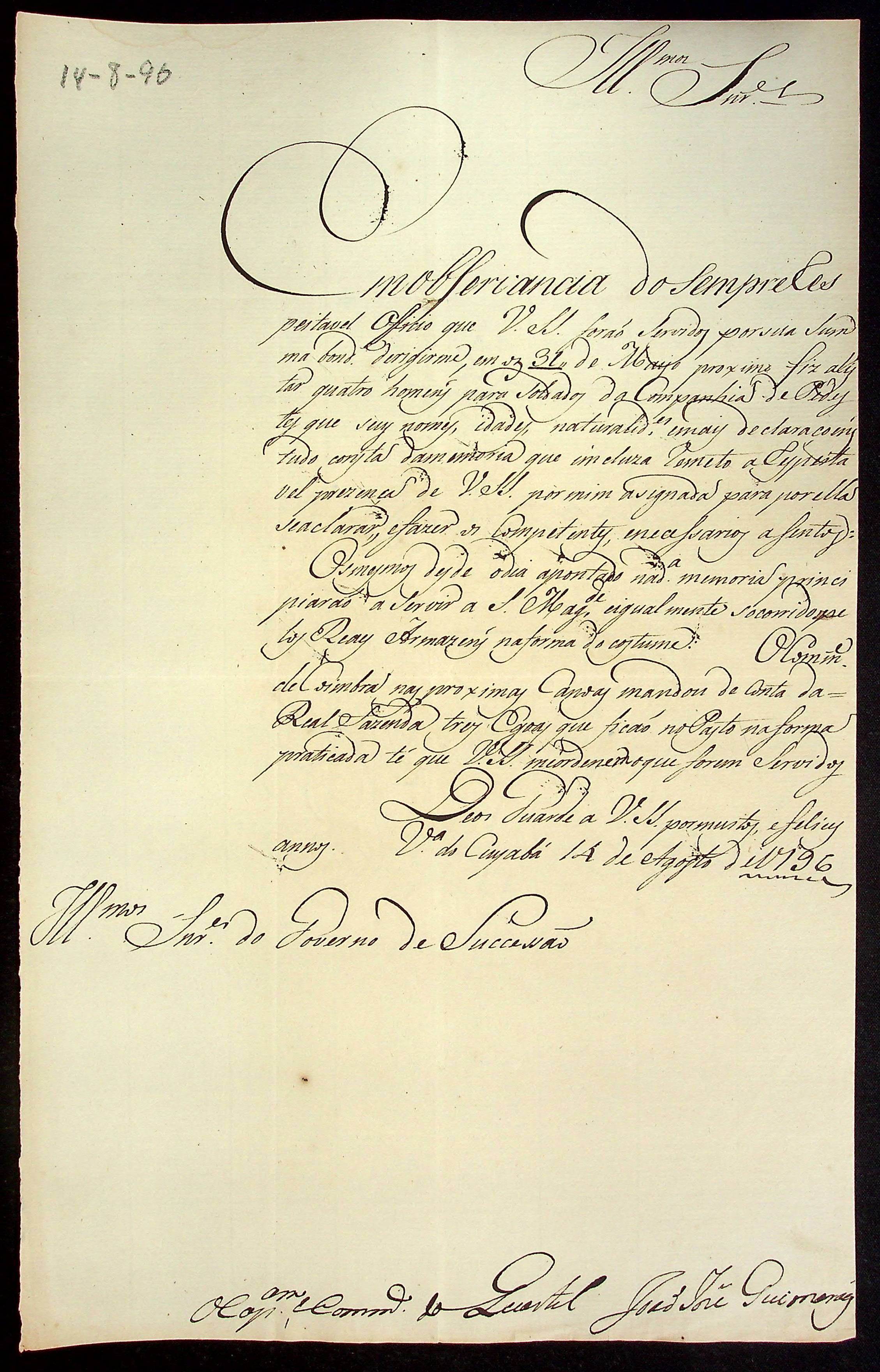 CARTA do Capitão e Comandante João Guimarães à [Primeira Junta Governativa da Capitania de Mato Grosso].