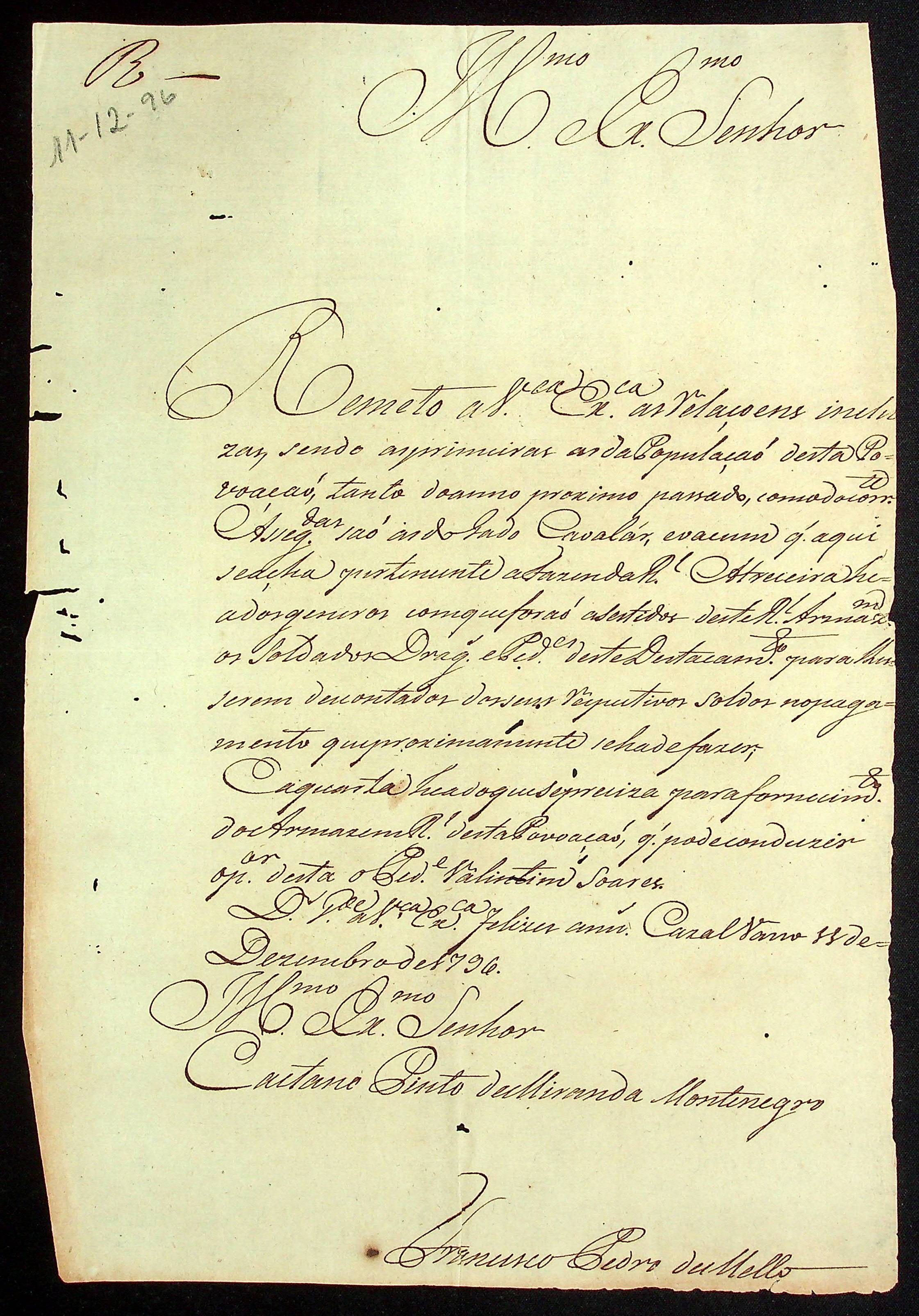 CARTA de Francisco Pedro de Melo ao [Governador e Capitão-General da Capitania de Mato Grosso] Caetano Pinto de Miranda Montenegro.