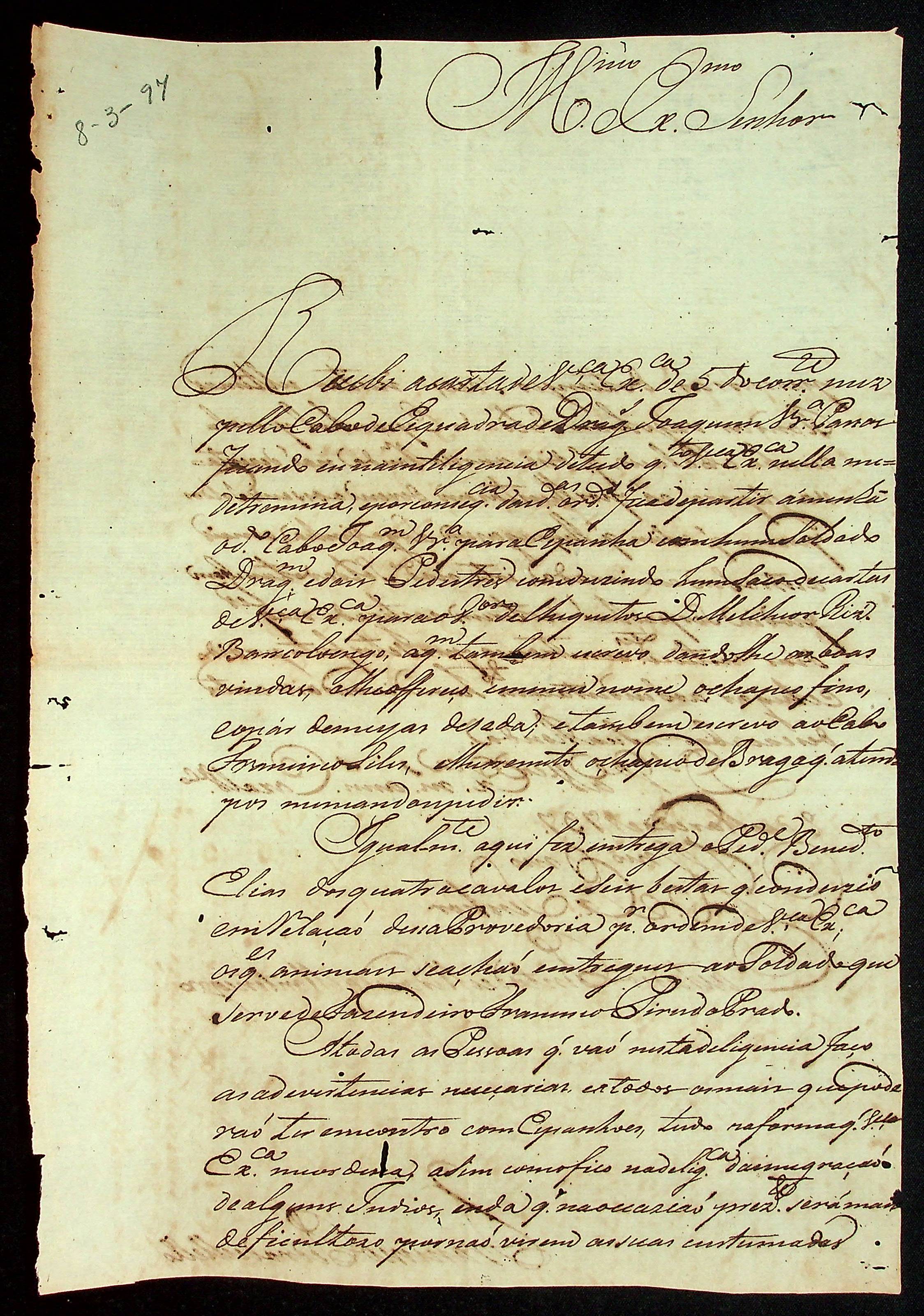 CARTA do [Comandante] Francisco Pedro de Melo ao [Governador e Capitão-General da Capitania de Mato Grosso] Caetano Pinto de Miranda e Montenegro.