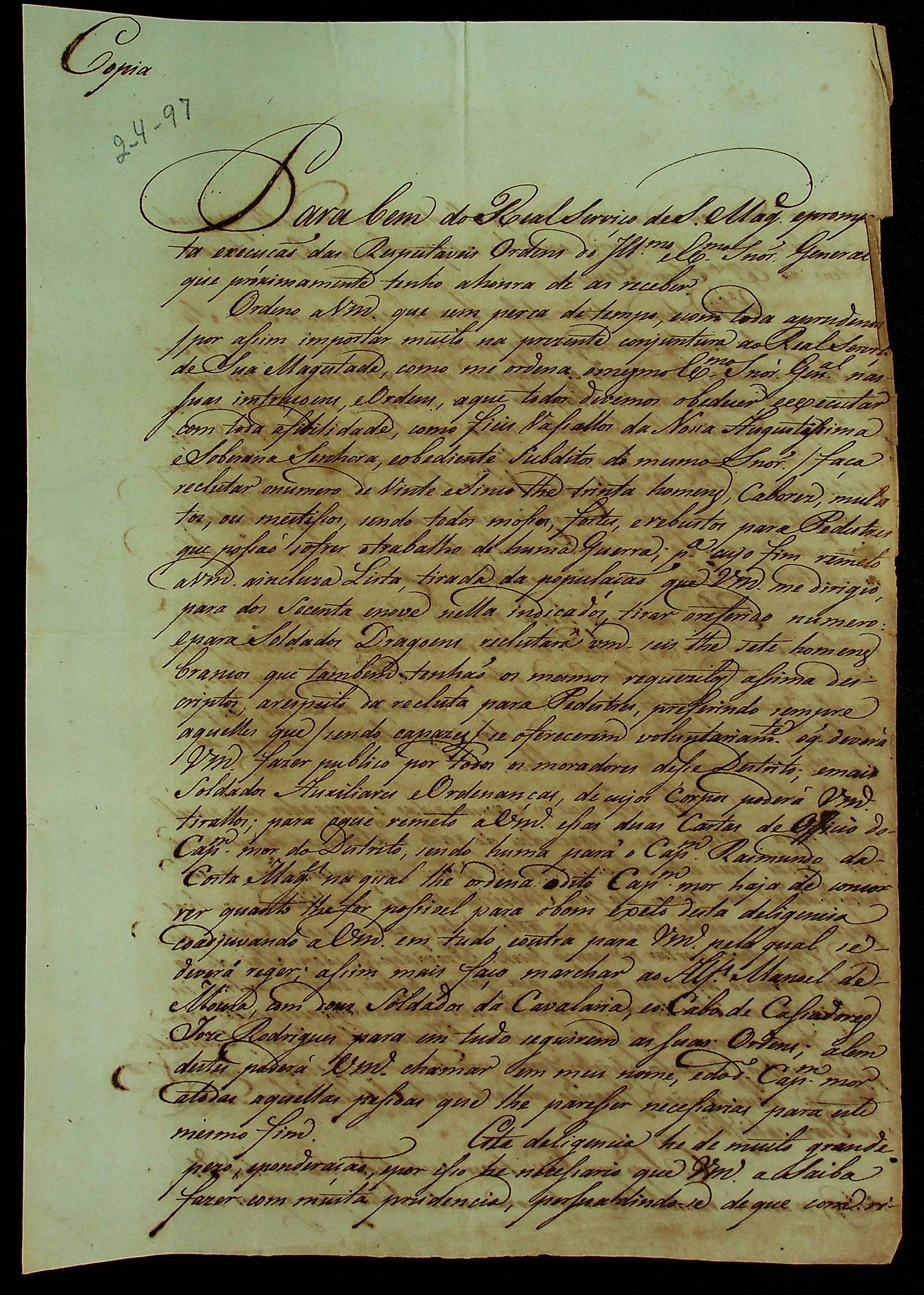 CARTA (cópia) do Mestre de Campo José Paes Falcão das Neves ao Tenente de Granadeiro e Comandante Salvador Rodrigues de Siqueira.