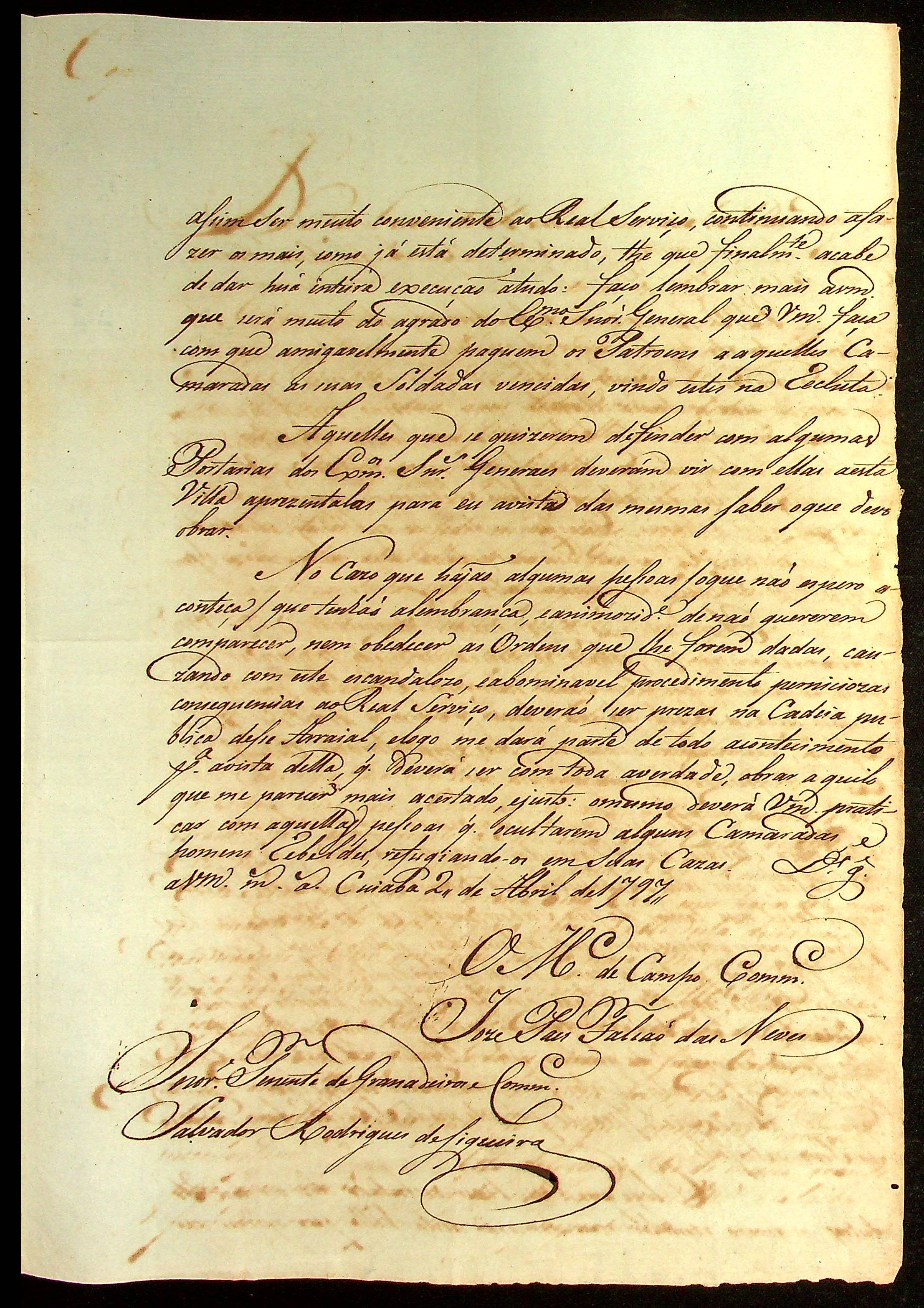 CARTA (cópia) do Mestre de Campo José Paes Falcão das Neves ao Tenente de Granadeiro e Comandante Salvador Rodrigues de Siqueira.