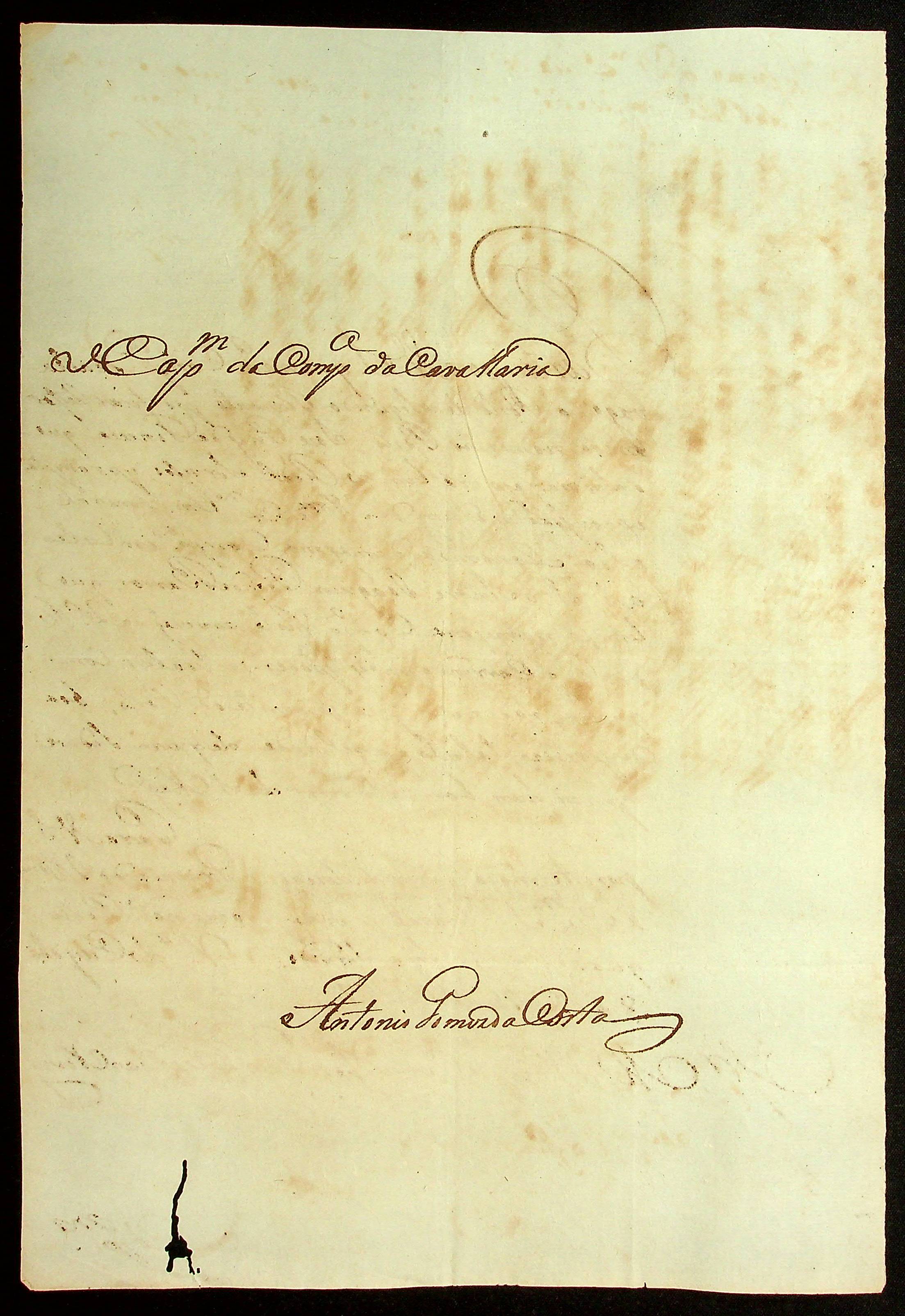 CARTA do Capitão da Companhia de Cavalaria Antônio Gomes da Costa ao Mestre de Campo Comandante José Paes Falcão das Neves.