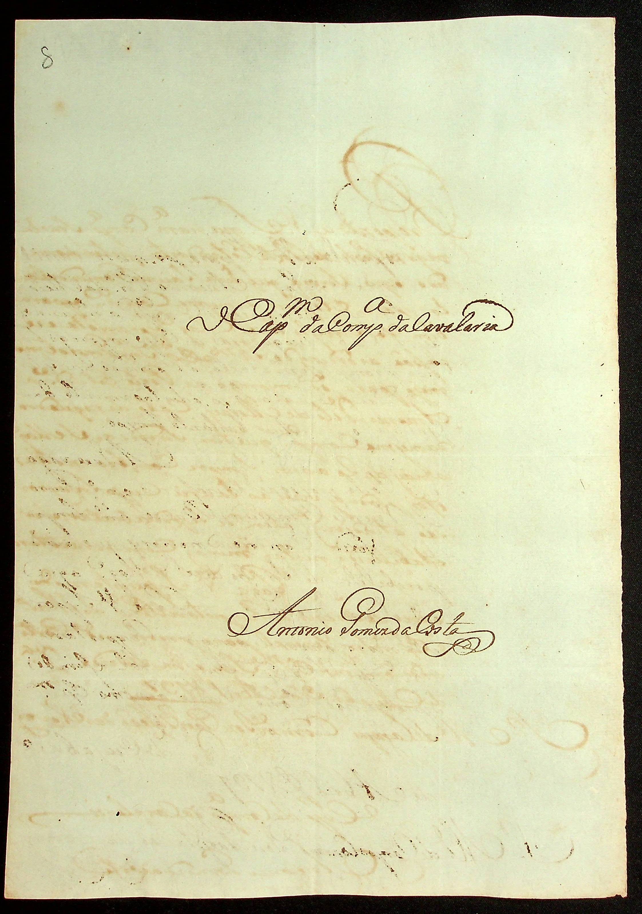 CARTA do Capitão da Companhia de Cavalaria Antônio Gomes da Costa ao Mestre de Campo Comandante José Paes Falcão das Neves.