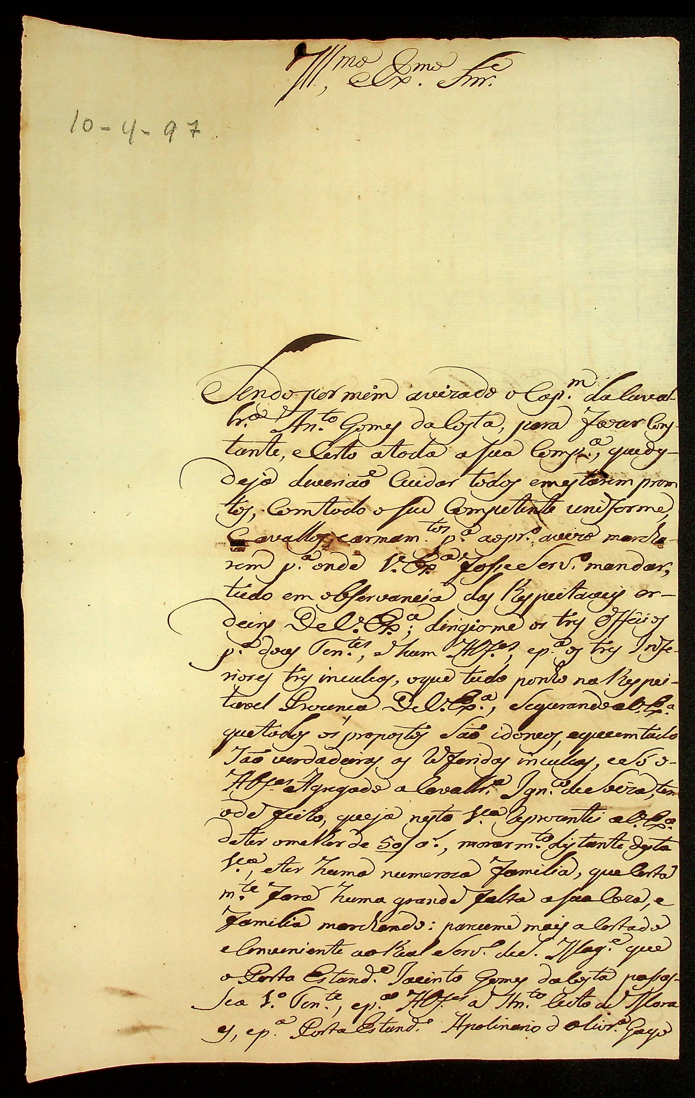CARTA do Mestre de Campo José Paes Falcão das Neves ao [Governador e Capitão-General da Capitania de Mato Grosso] Caetano Pinto de Miranda e Montenegro.