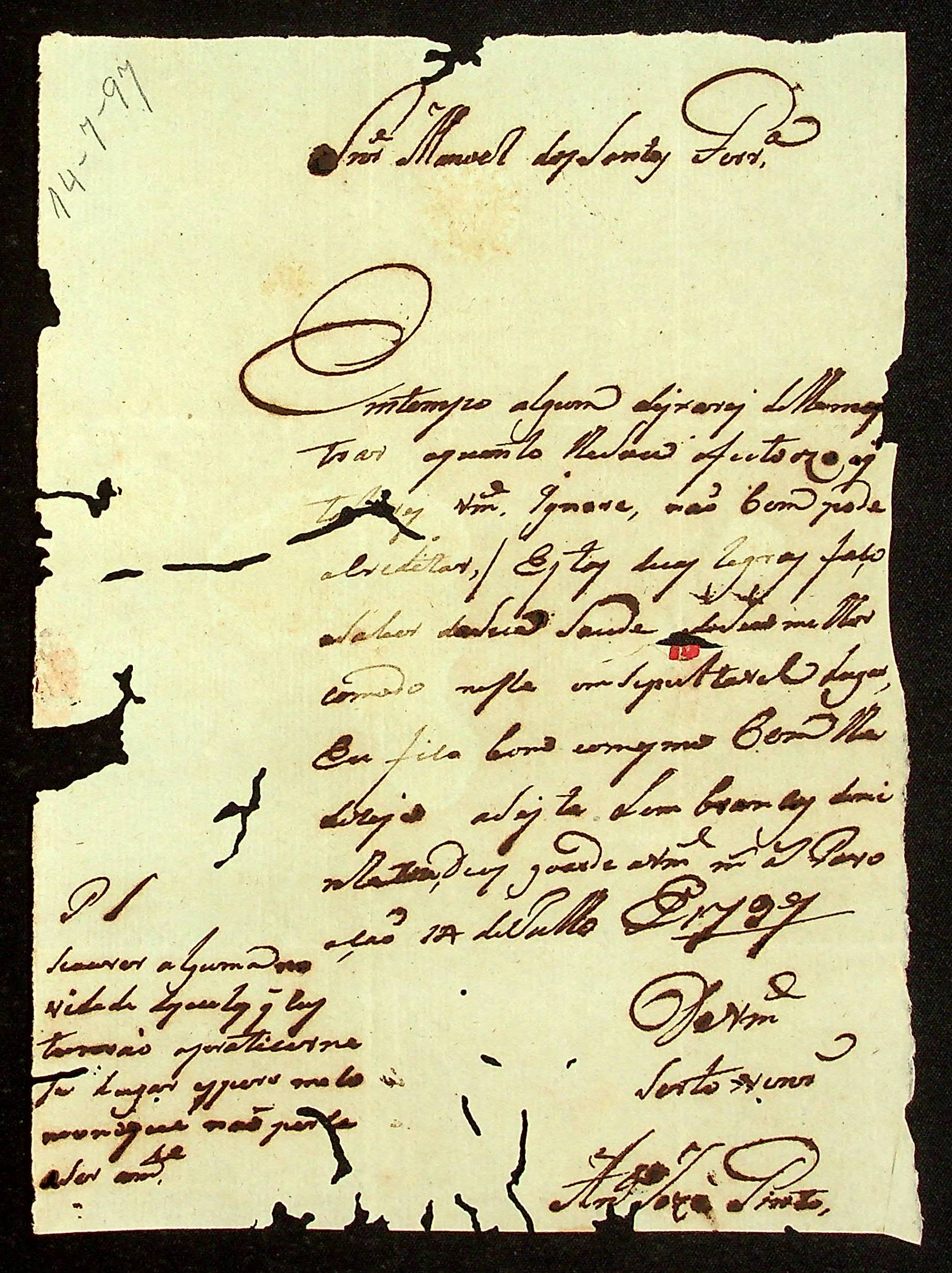 CARTA de Antônio José Pinto a Manoel dos Santos Pereira.