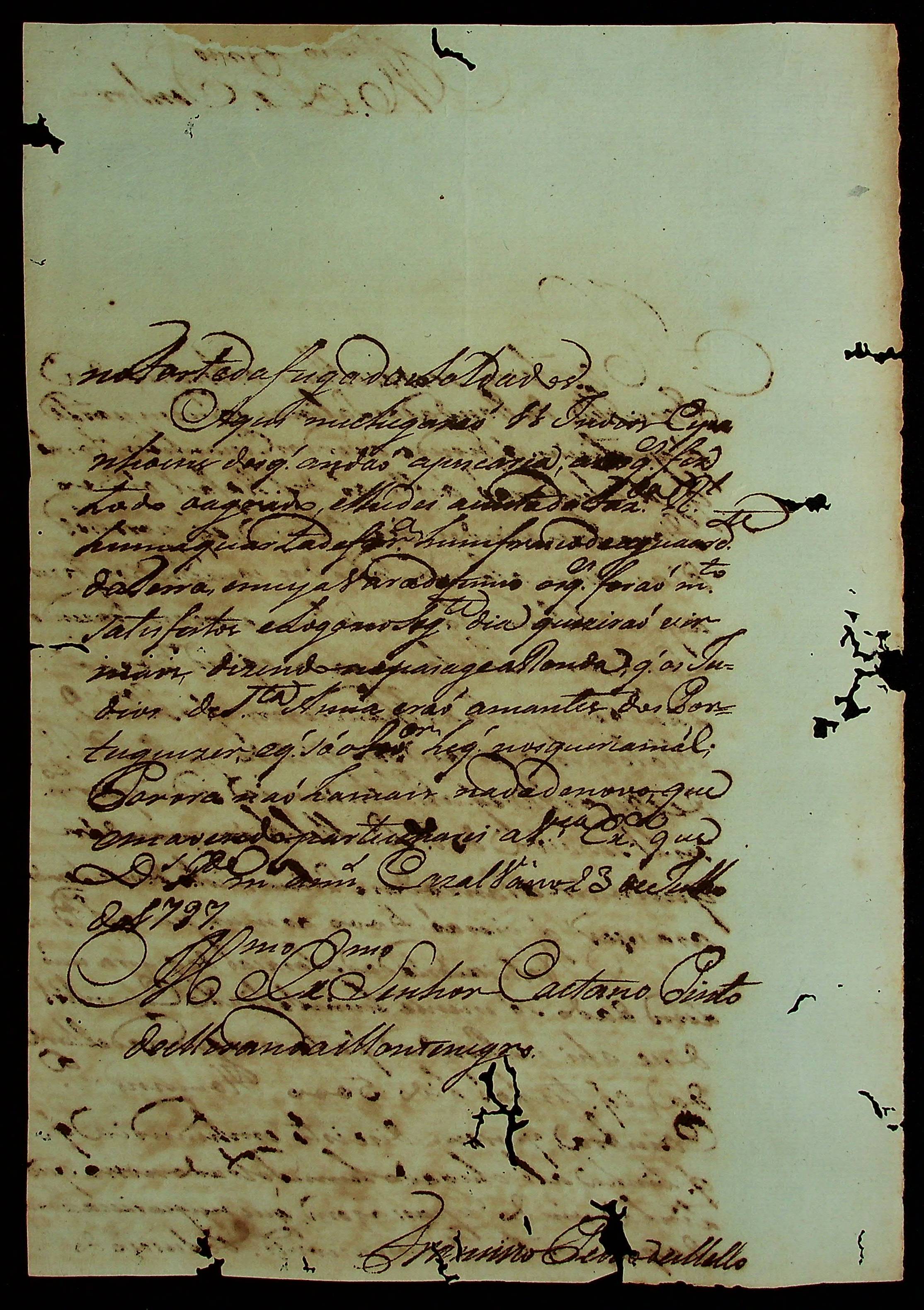 CARTA do [Comandante] Francisco Pedro de Melo ao [Governador e Capitão-General da Capitania de Mato Grosso] Caetano Pinto de Miranda e Montenegro.