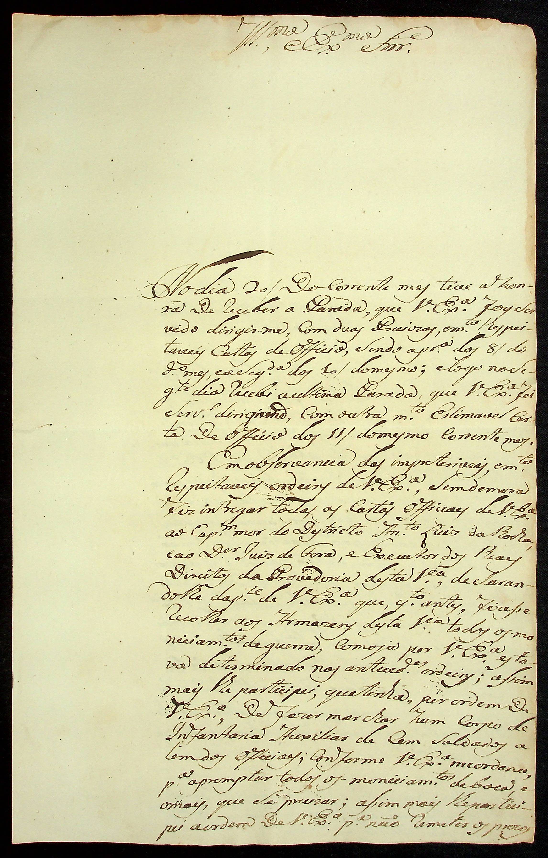 CARTA do Mestre de Campo José Paes Falcão das Neves ao [Governador e Capitão-General da Capitania de Mato Grosso] Caetano Pinto de Miranda e Montenegro.