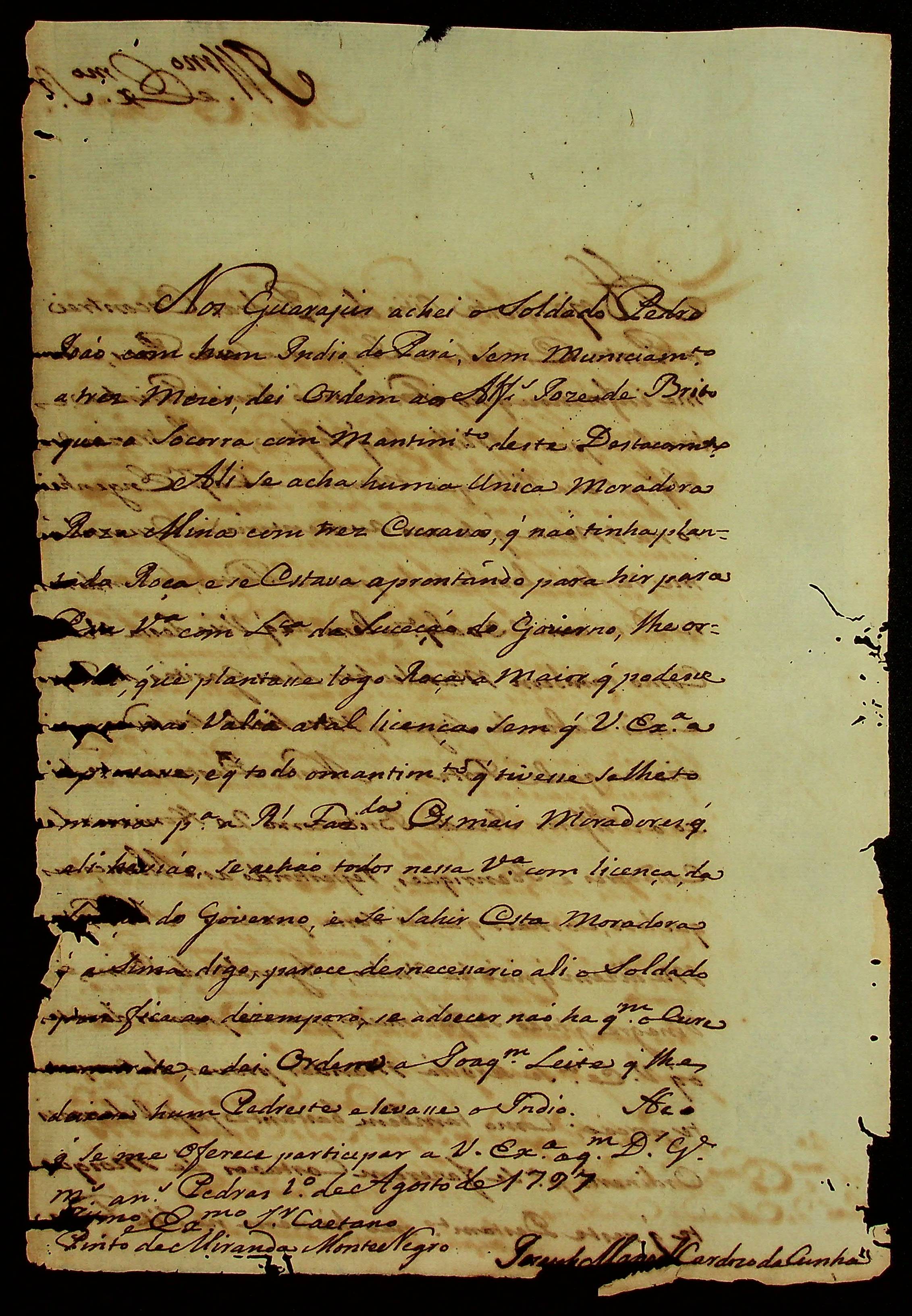 CARTA do [Sargento-mor] José Manoel Cardoso da Cunha ao [Governador e Capitão-General da Capitania de Mato Grosso] Caetano Pinto de Miranda e Montenegro.