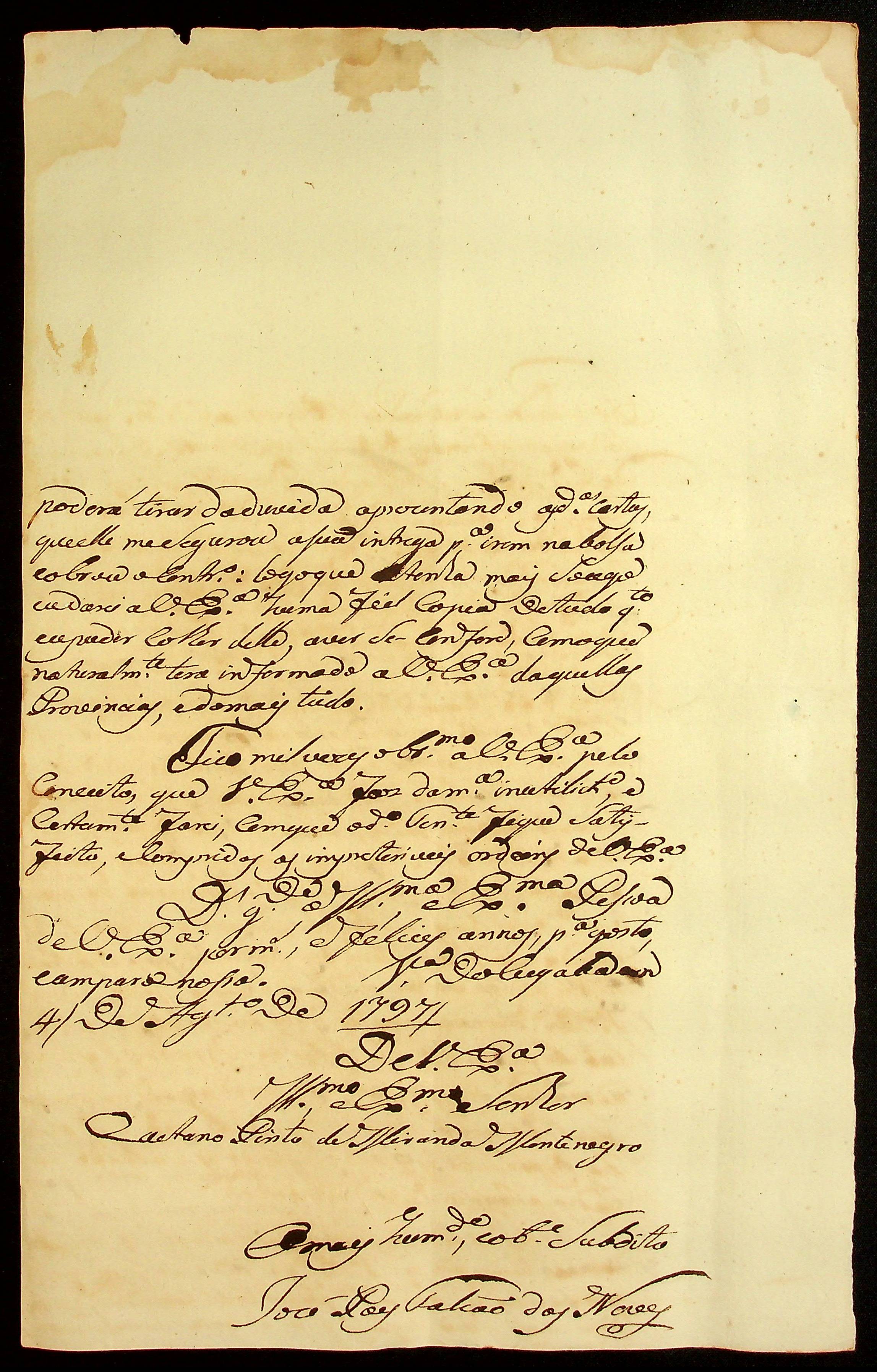 CARTA do Mestre de Campo José Paes Falcão das Neves ao [Governador e Capitão-General da Capitania de Mato Grosso] Caetano Pinto de Miranda e Montenegro.